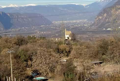 versuchte. Heute sind Hof und Kirche längst in bäuerlichem Besitz. Über den Kiechelberg hinweg erblicken wir die Stadt Bozen, dahinter die Sarner Scharte und links den Ifnger und die Plattenspitze. Unser Weg führt alsbald in den Wald, an einem besonderen „Memory“ und interessanten Stationen vorbei, bis zur viel befahrenen Straße, die wir überqueren.