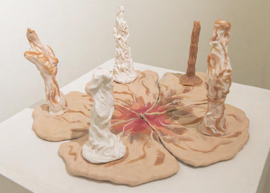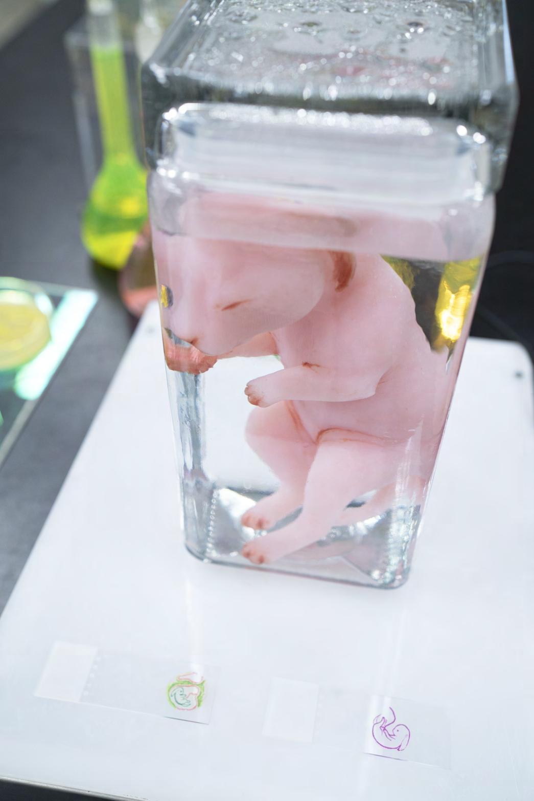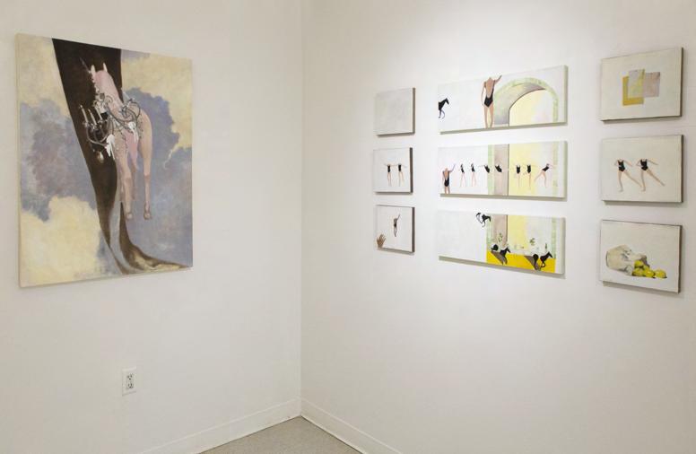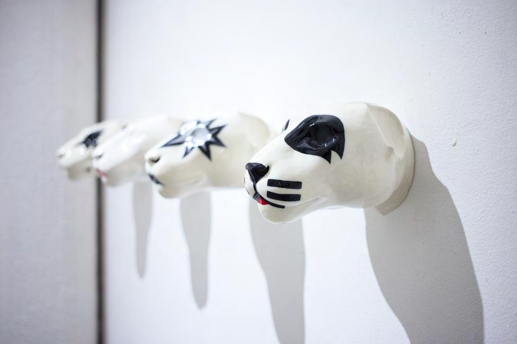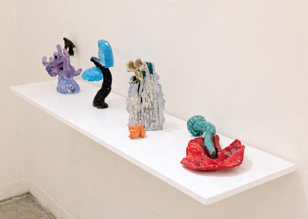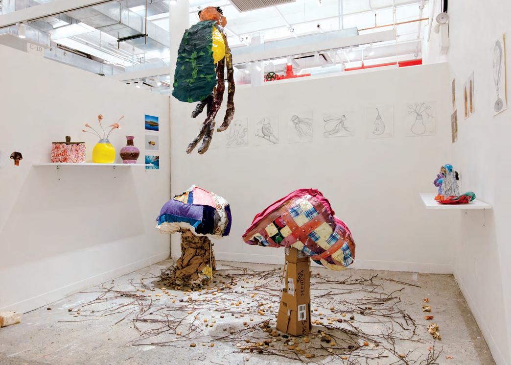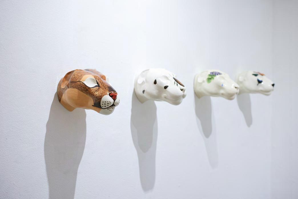 beautiful composition of handmade objects. Downstairs, just to the left of the building’s entrance, was a large gallery space featuring the sculpture of Nicholas DelCastillo, whose taxidermied works are part of a fictionalized lab experiment to create a new breed of animal. Delcastillo treats this experiment as a proxy for himself; he writes in the wall text that he too felt like a unique species.
