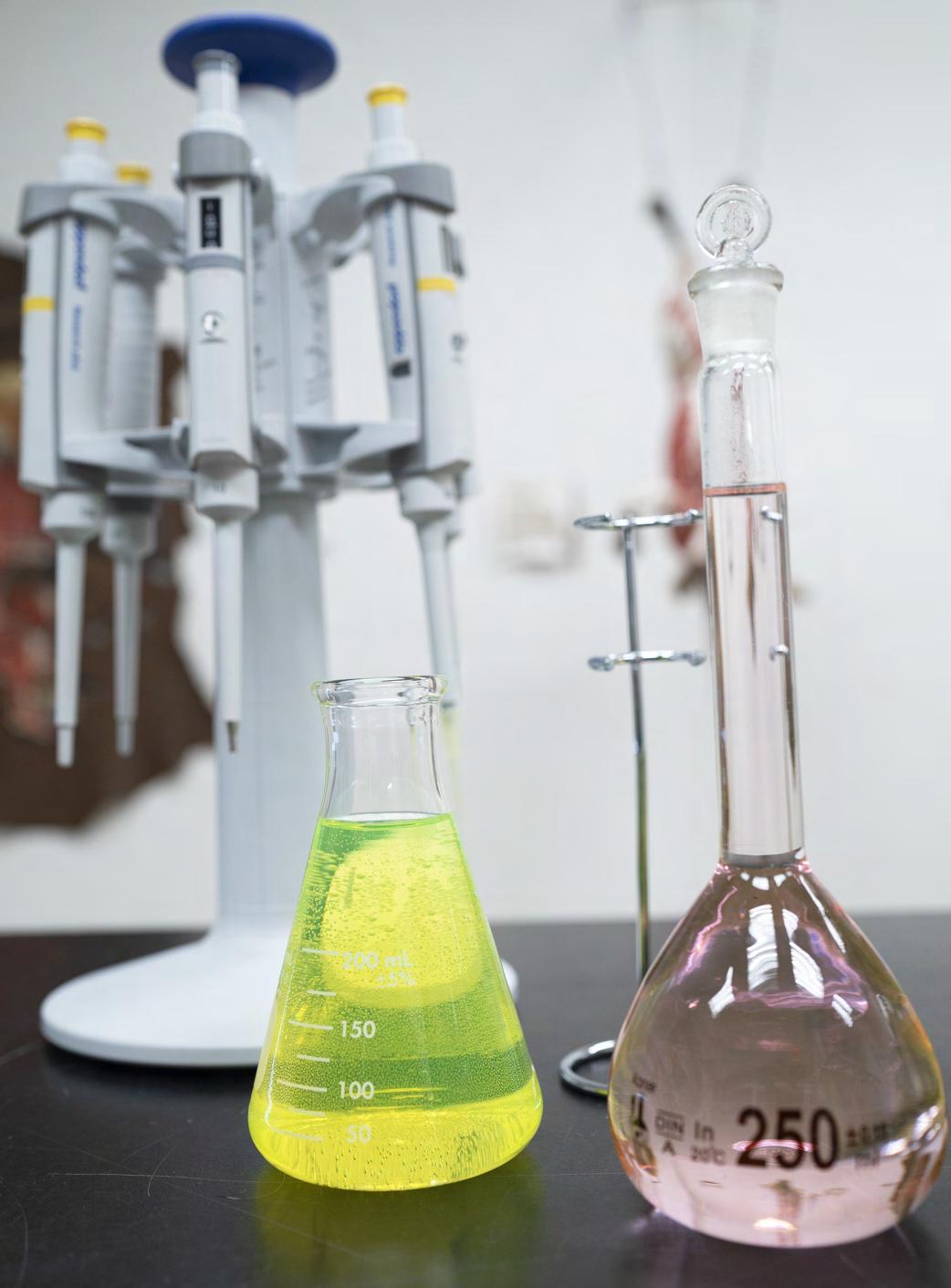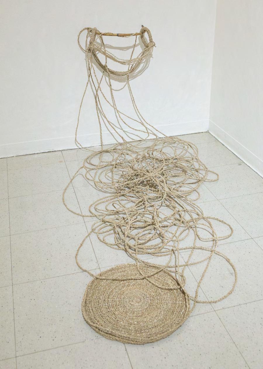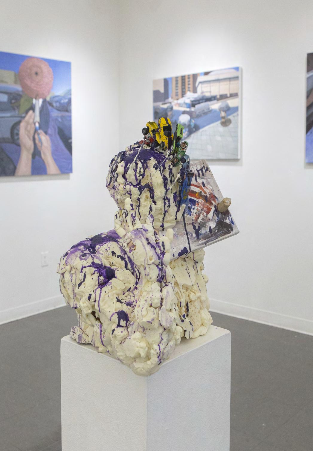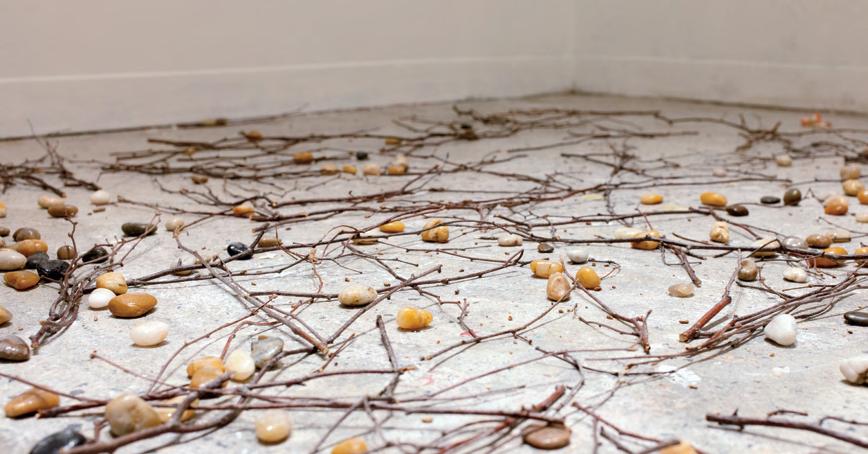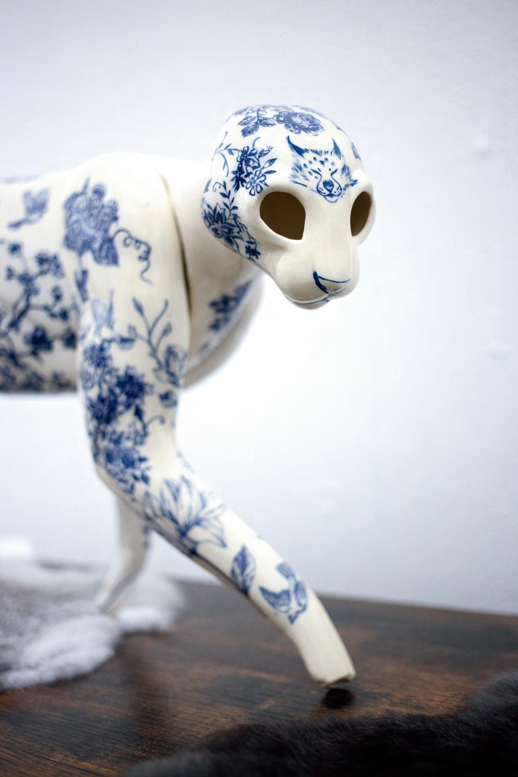 beautiful composition of handmade objects. Downstairs, just to the left of the building’s entrance, was a large gallery space featuring the sculpture of Nicholas DelCastillo, whose taxidermied works are part of a fictionalized lab experiment to create a new breed of animal. Delcastillo treats this experiment as a proxy for himself; he writes in the wall text that he too felt like a unique species.