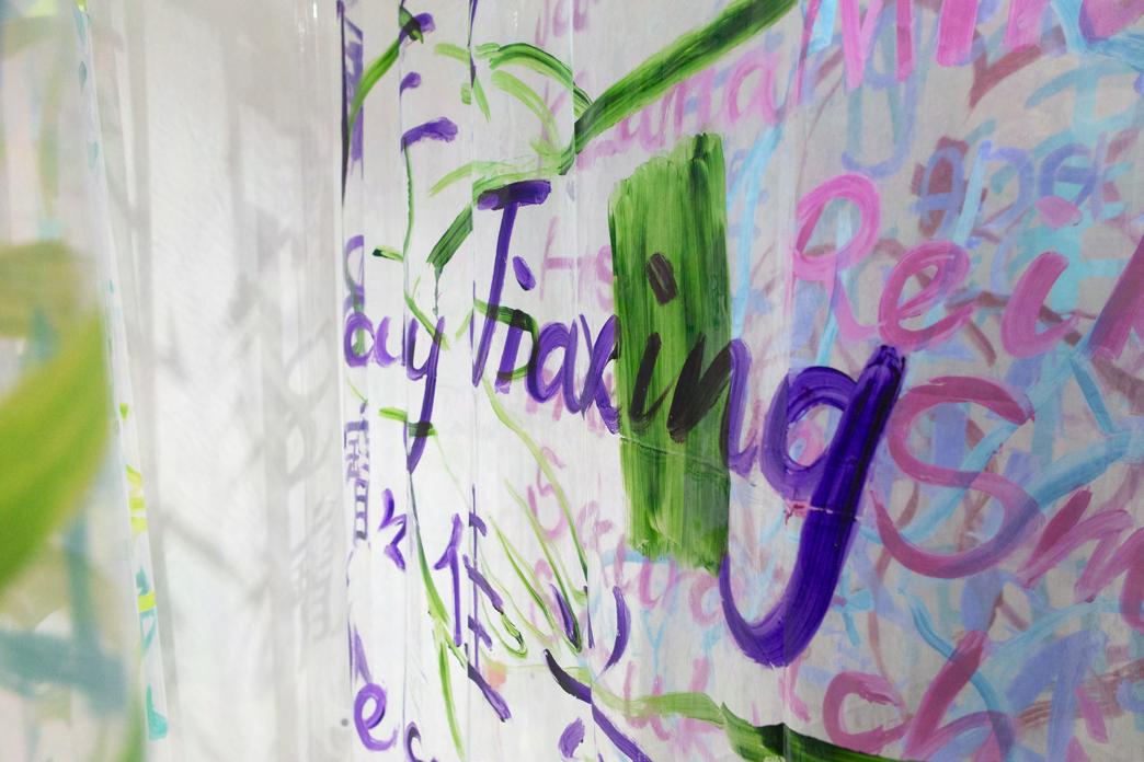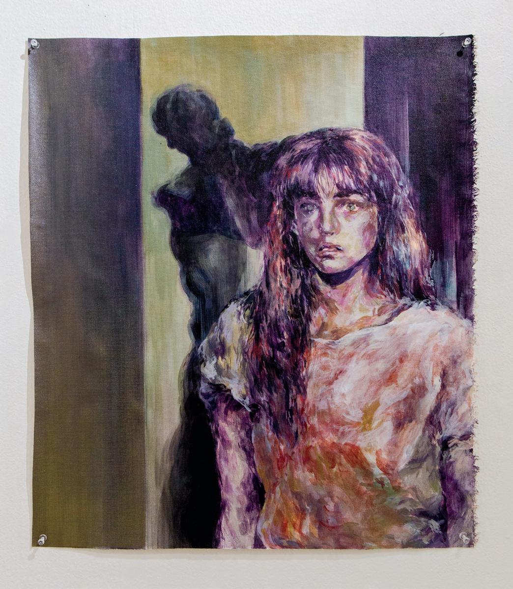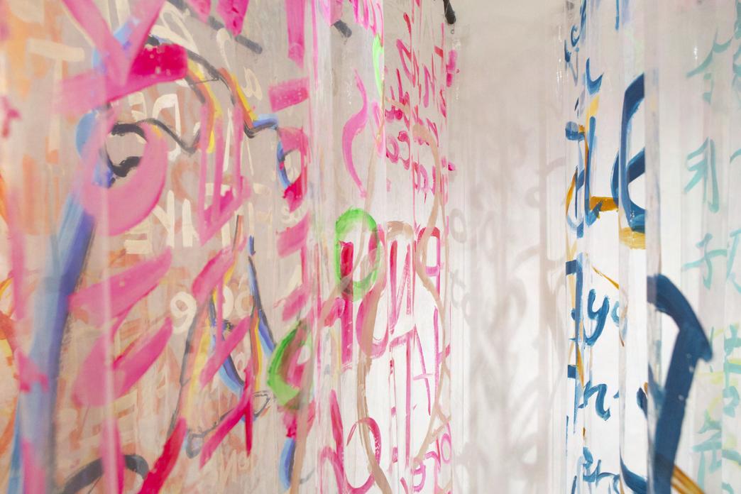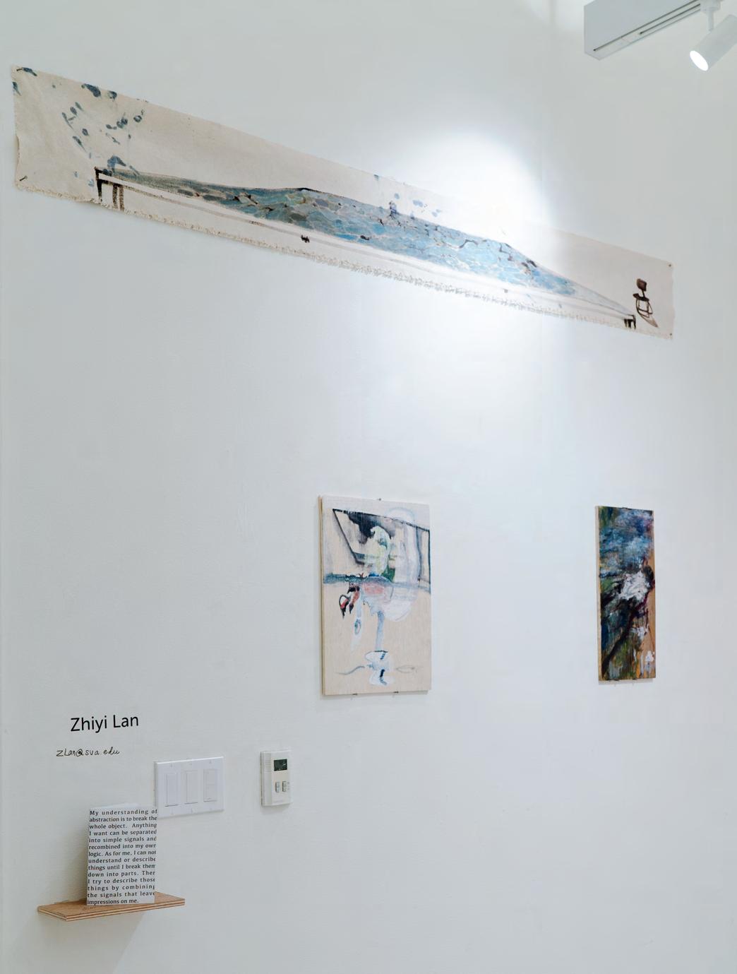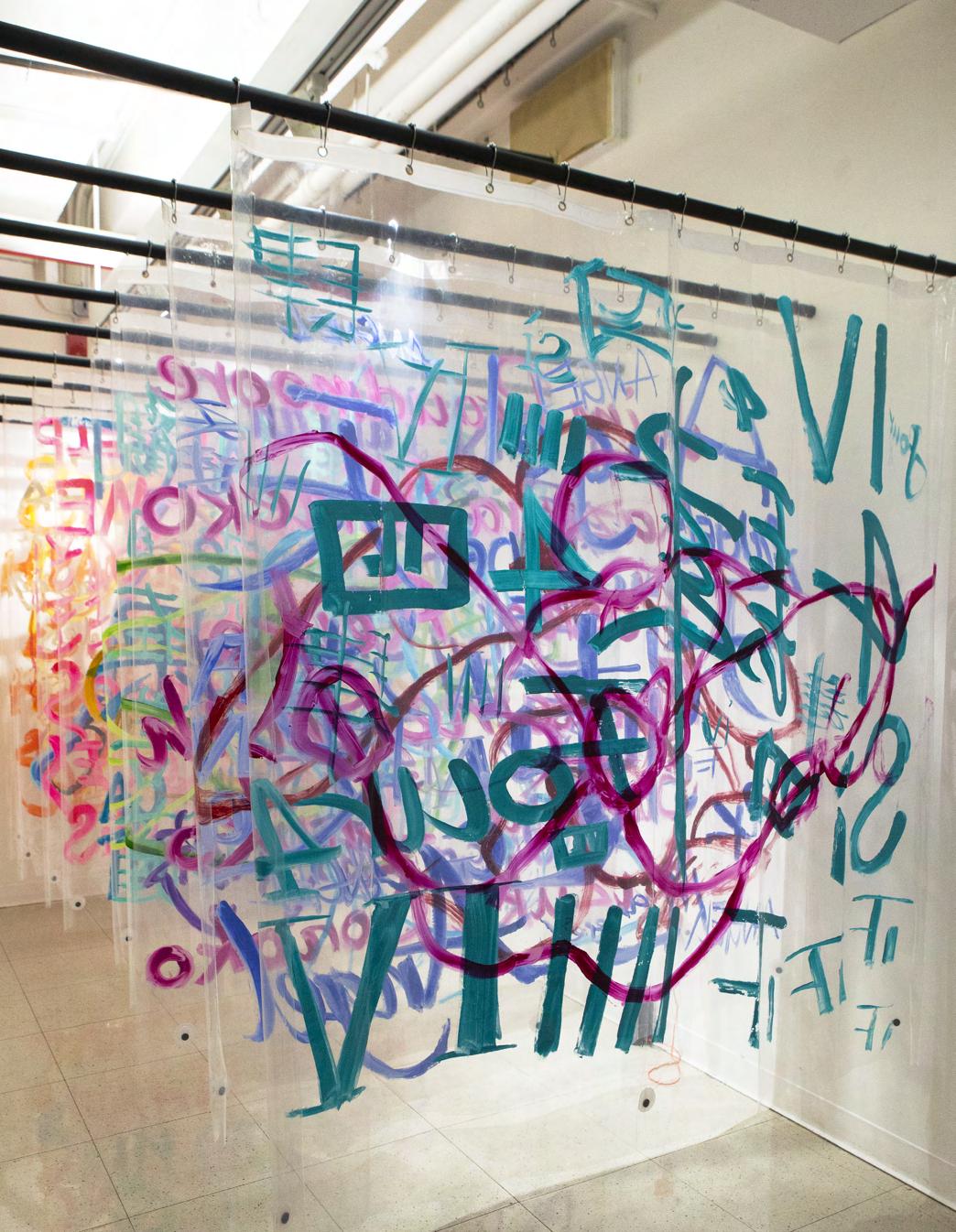 Also on display were skillful paintings. Little tableaus by Christopher Lochmann; stunning and sad clownlike portraits by Isabella Perna; figurative scenes from horror movies by Sol Jin Park; Cy Twombly–esque gestural paintings by Zun Liu; the minimal abstract landscapes by Zhiyi Lan. An entire room was occupied by colorful shower curtains with words written in Chinese and English by Lan Guo, which reminded me of the preoccupation many of these students had with language. The letters overlap with one another, distorting any meaning. The two scripts suggest an artist straddling two worlds.