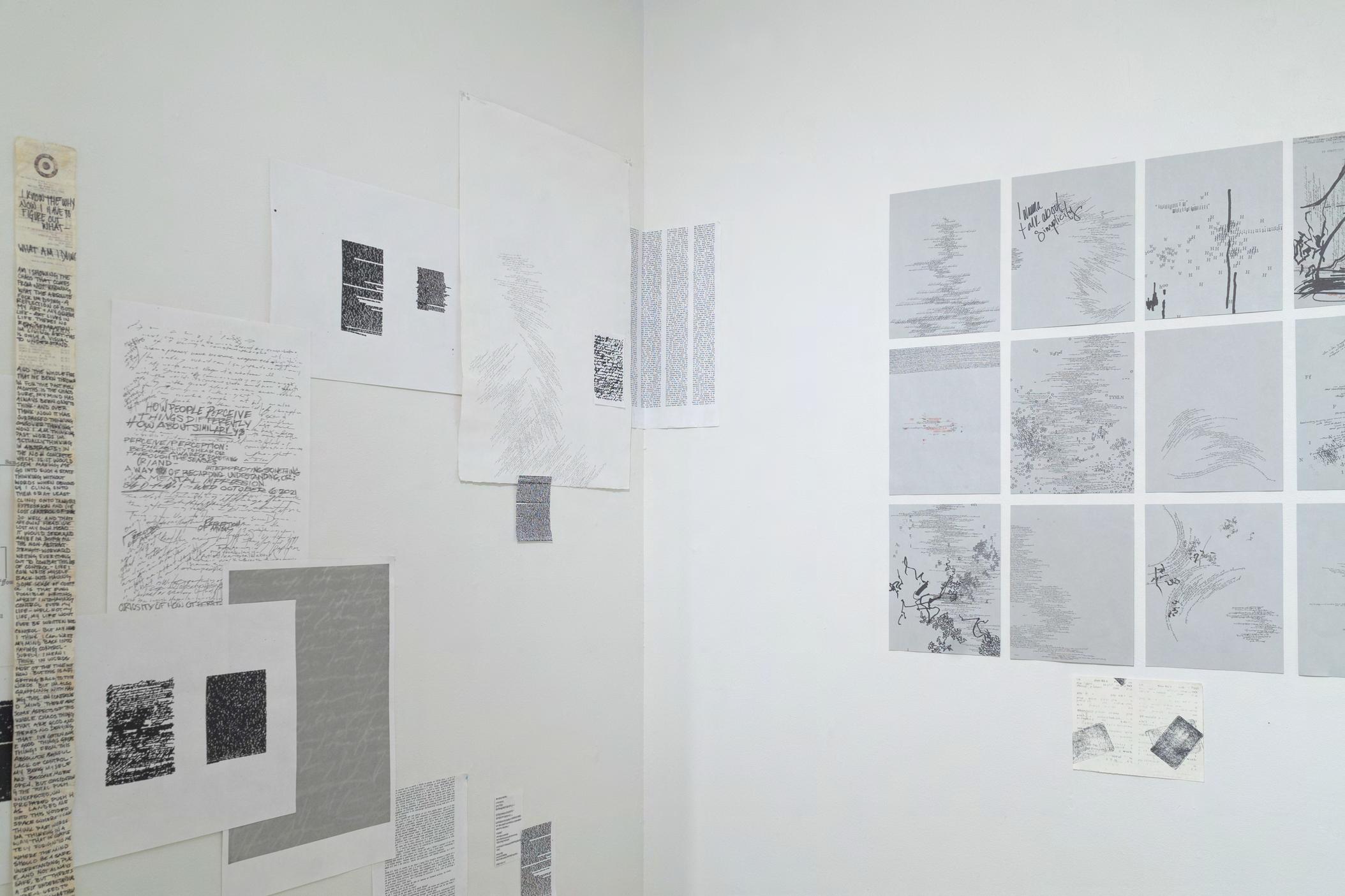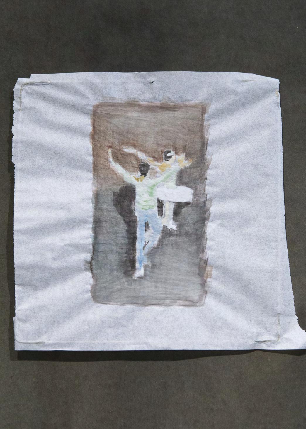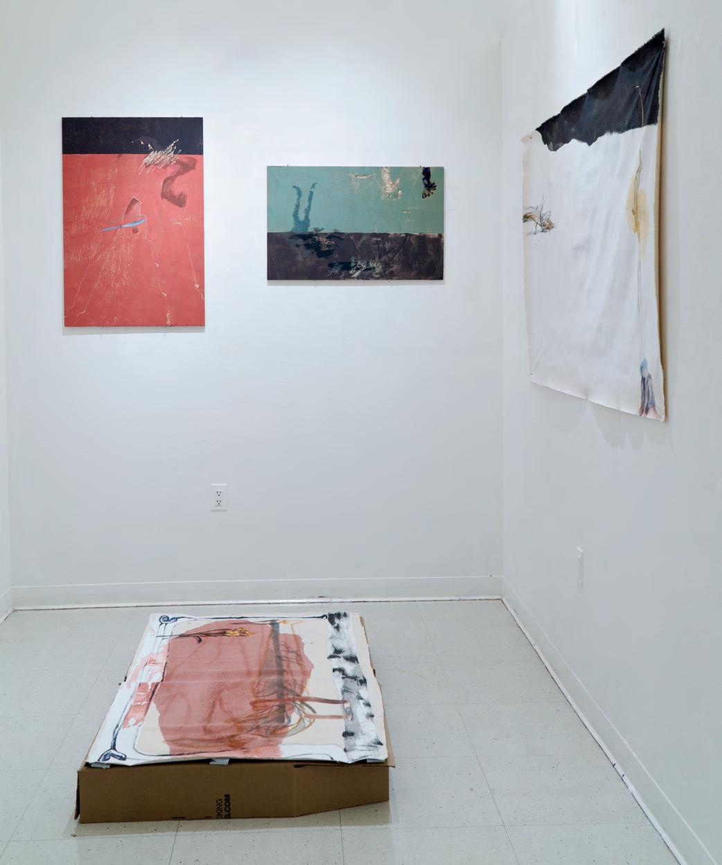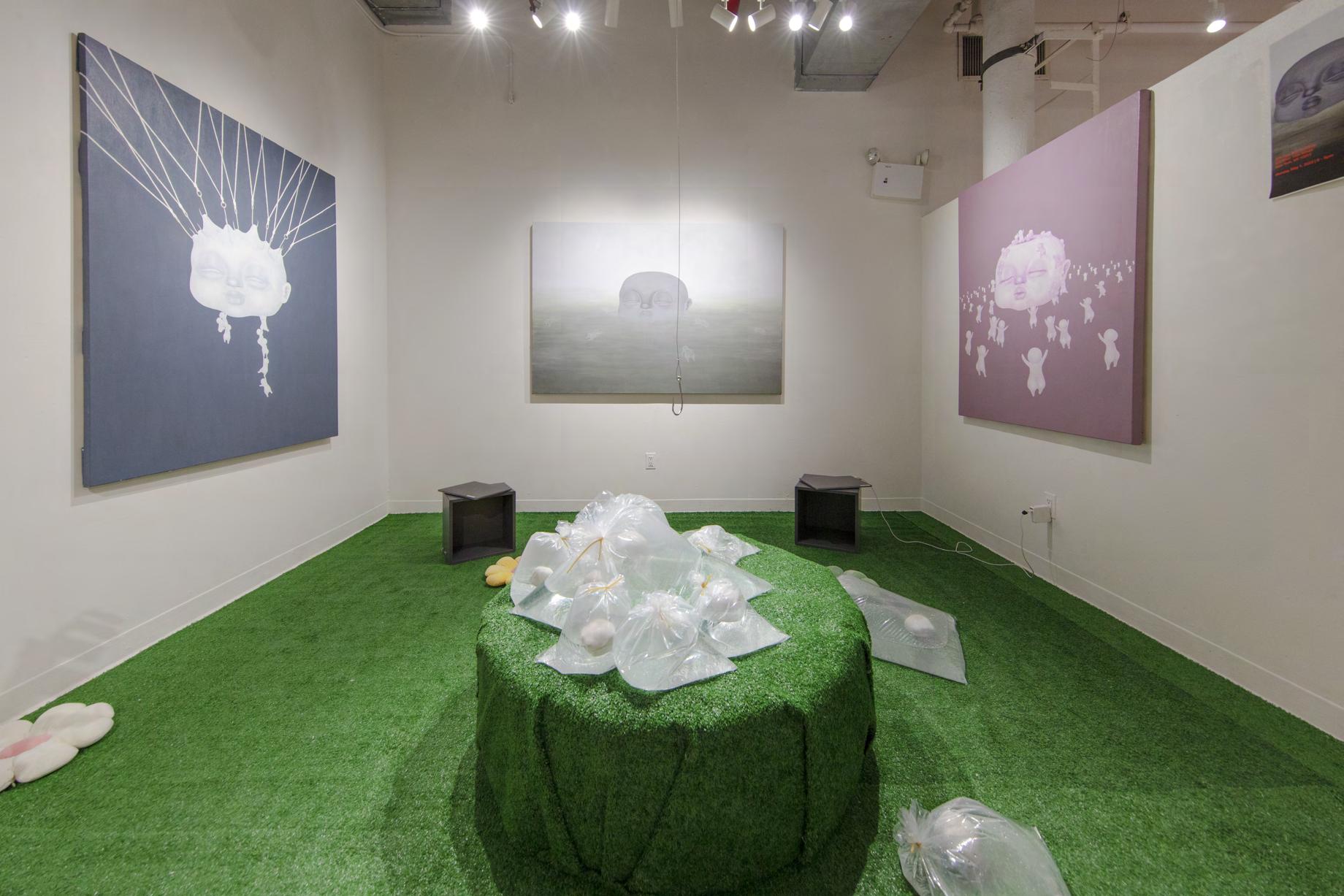 Also on display were skillful paintings. Little tableaus by Christopher Lochmann; stunning and sad clownlike portraits by Isabella Perna; figurative scenes from horror movies by Sol Jin Park; Cy Twombly–esque gestural paintings by Zun Liu; the minimal abstract landscapes by Zhiyi Lan. An entire room was occupied by colorful shower curtains with words written in Chinese and English by Lan Guo, which reminded me of the preoccupation many of these students had with language. The letters overlap with one another, distorting any meaning. The two scripts suggest an artist straddling two worlds.