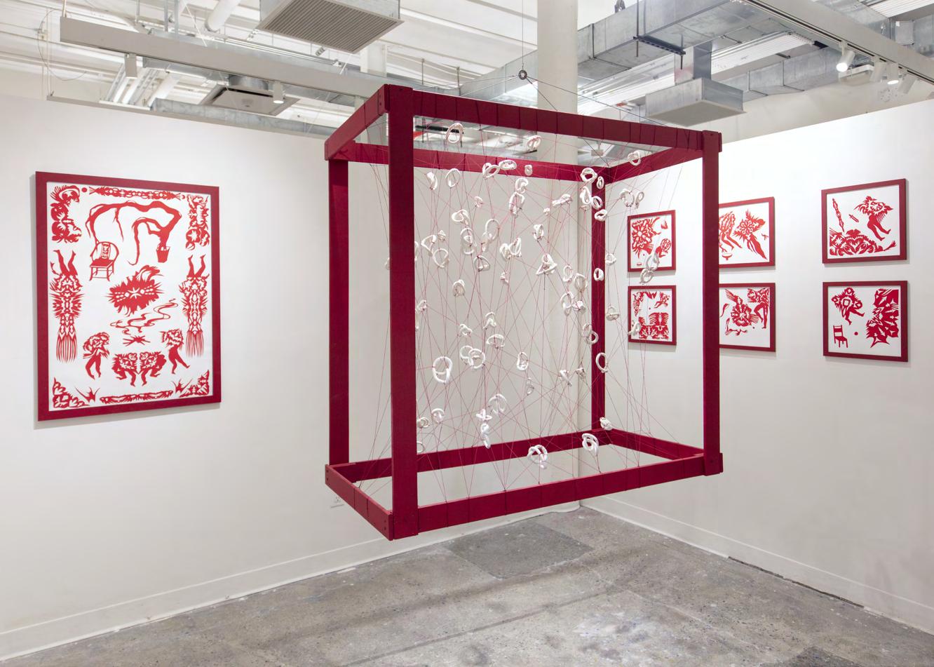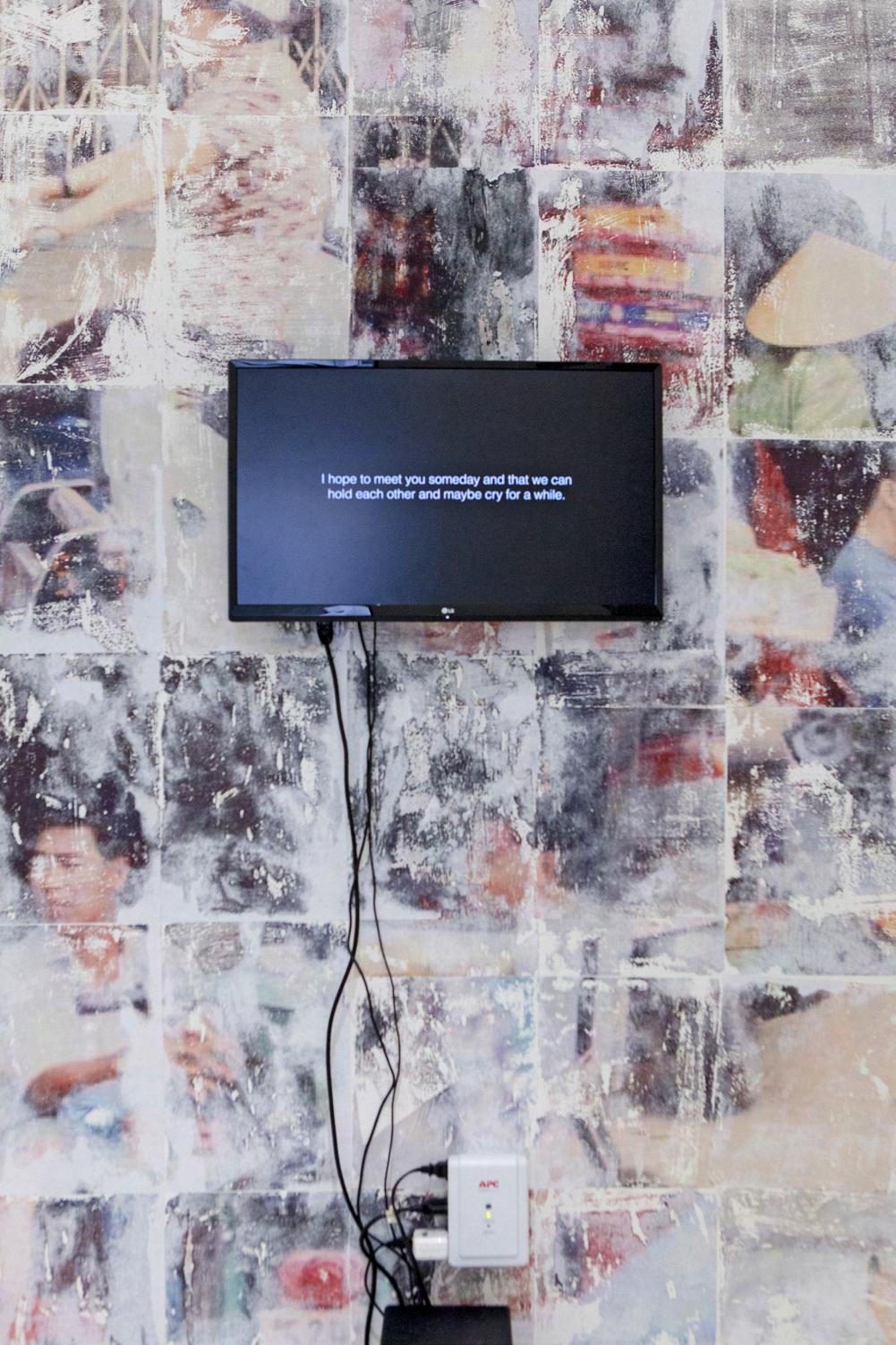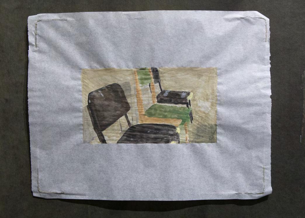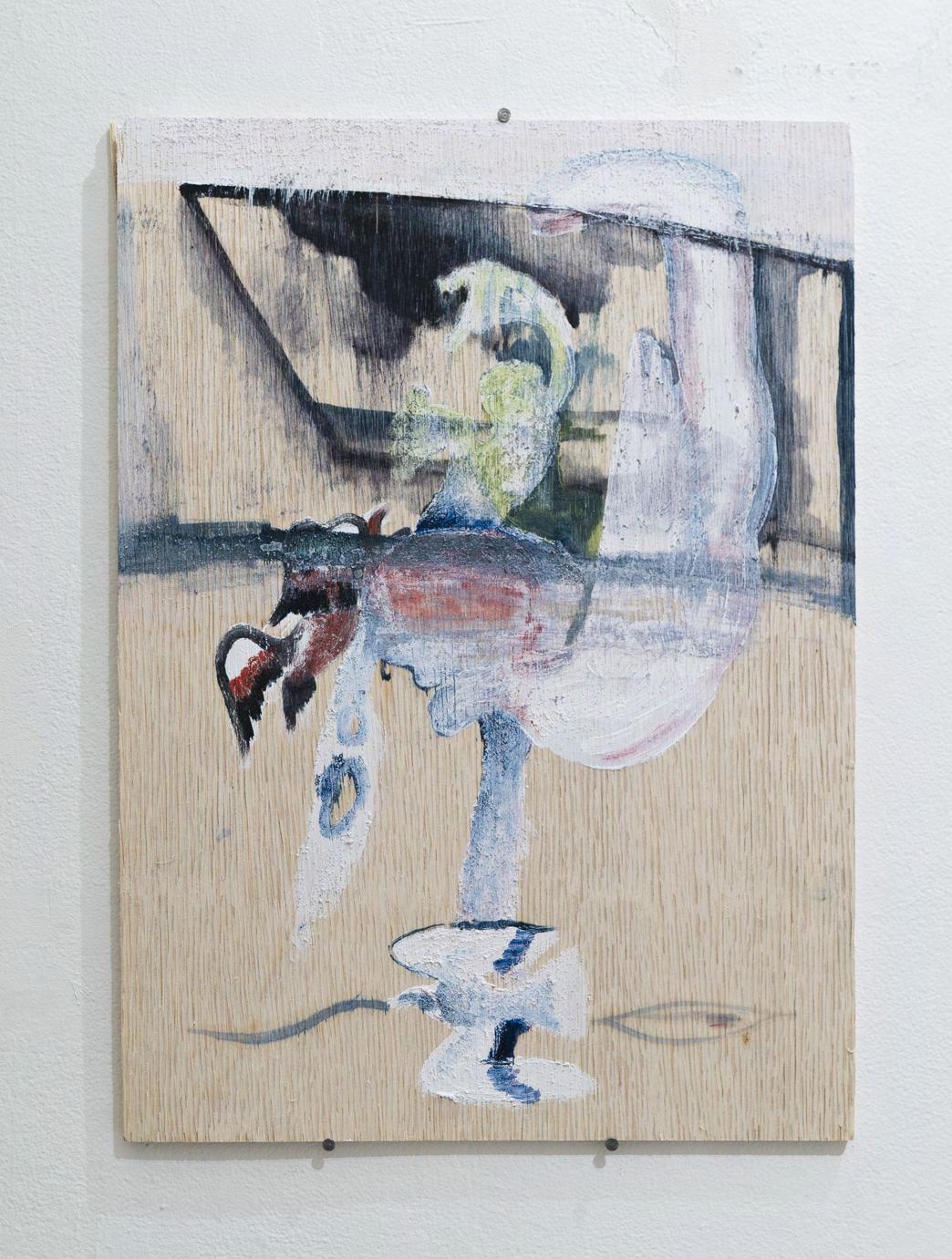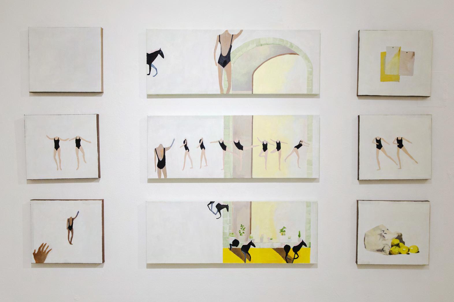 Also on display were skillful paintings. Little tableaus by Christopher Lochmann; stunning and sad clownlike portraits by Isabella Perna; figurative scenes from horror movies by Sol Jin Park; Cy Twombly–esque gestural paintings by Zun Liu; the minimal abstract landscapes by Zhiyi Lan. An entire room was occupied by colorful shower curtains with words written in Chinese and English by Lan Guo, which reminded me of the preoccupation many of these students had with language. The letters overlap with one another, distorting any meaning. The two scripts suggest an artist straddling two worlds.