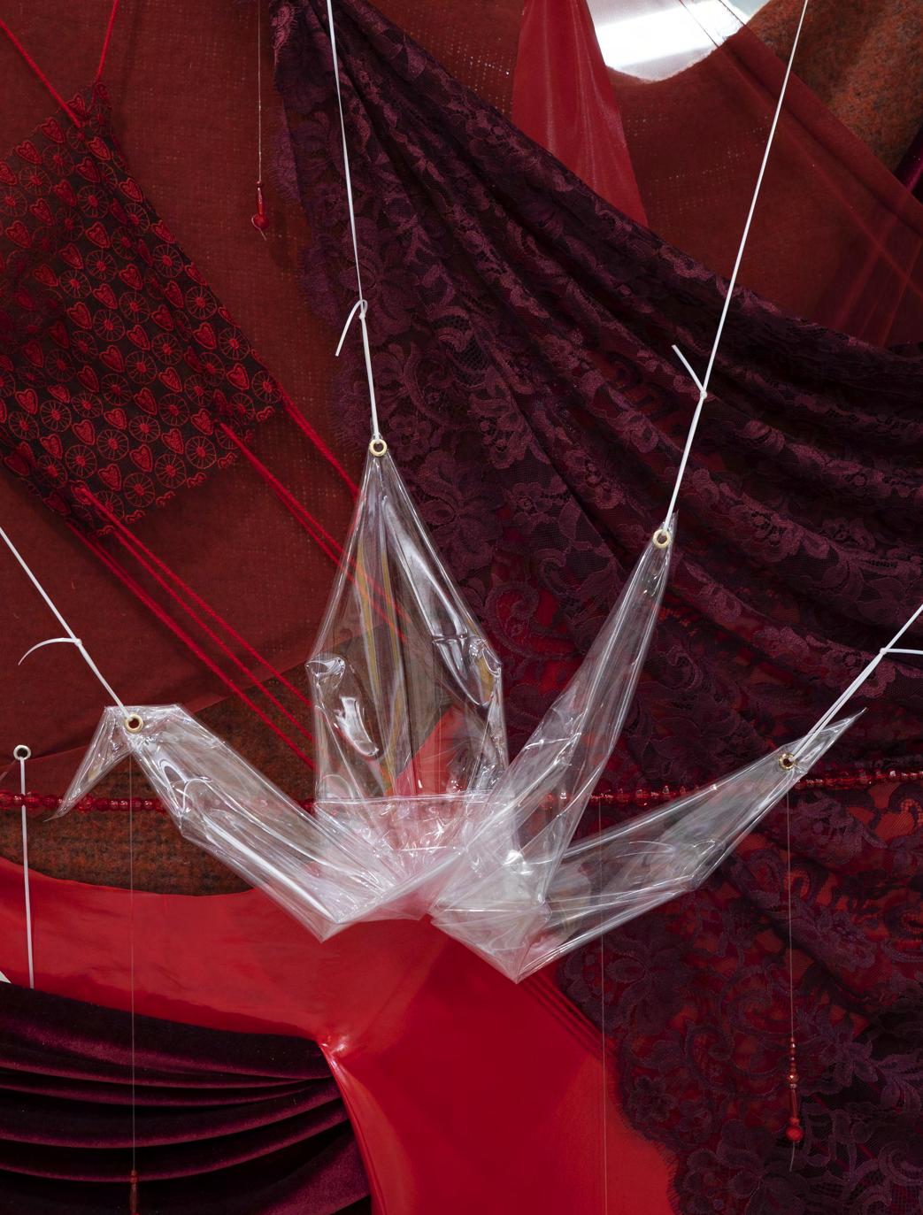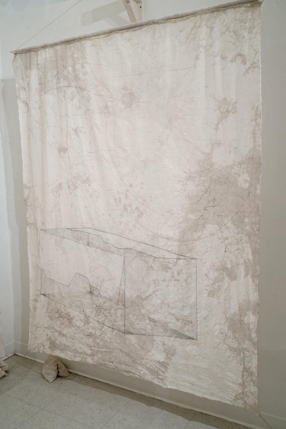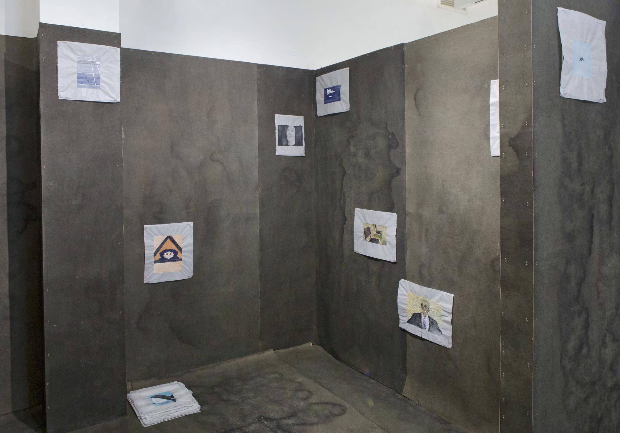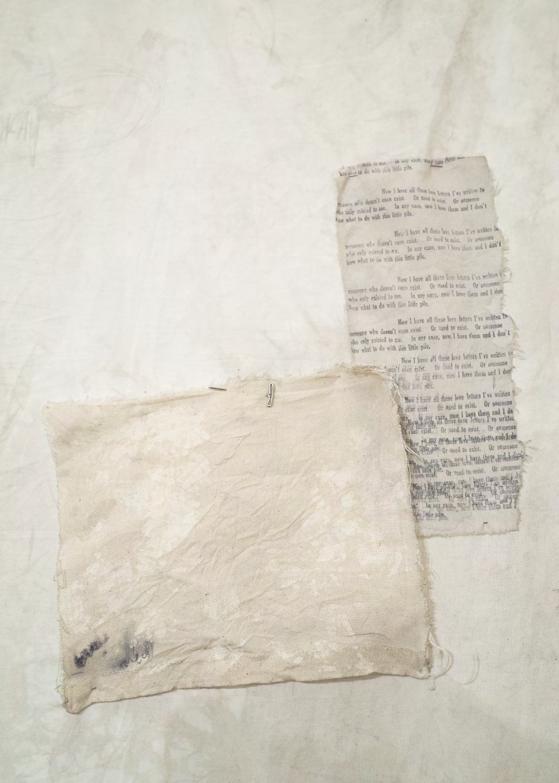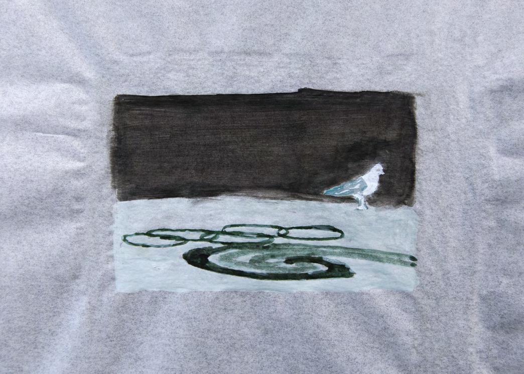 Also on display were skillful paintings. Little tableaus by Christopher Lochmann; stunning and sad clownlike portraits by Isabella Perna; figurative scenes from horror movies by Sol Jin Park; Cy Twombly–esque gestural paintings by Zun Liu; the minimal abstract landscapes by Zhiyi Lan. An entire room was occupied by colorful shower curtains with words written in Chinese and English by Lan Guo, which reminded me of the preoccupation many of these students had with language. The letters overlap with one another, distorting any meaning. The two scripts suggest an artist straddling two worlds.