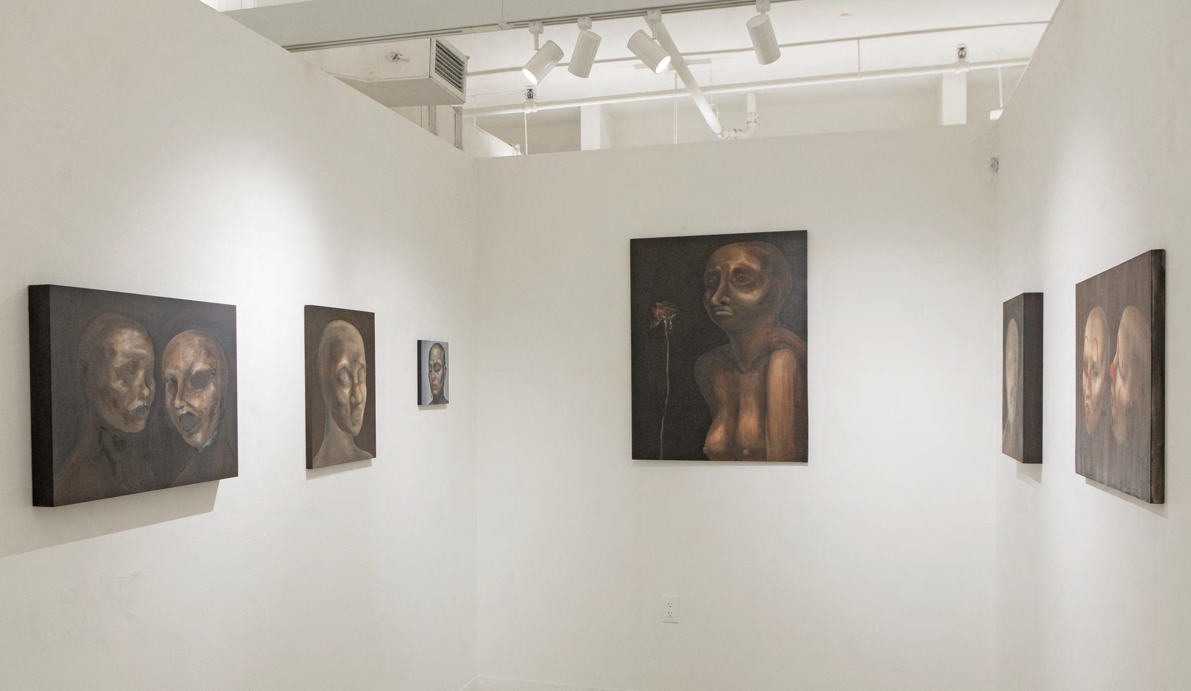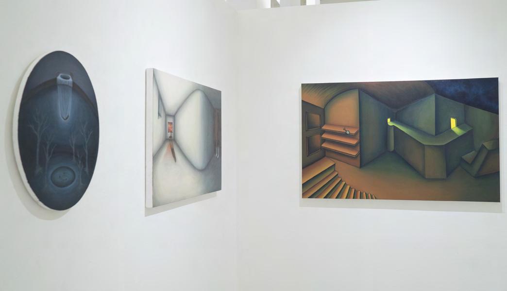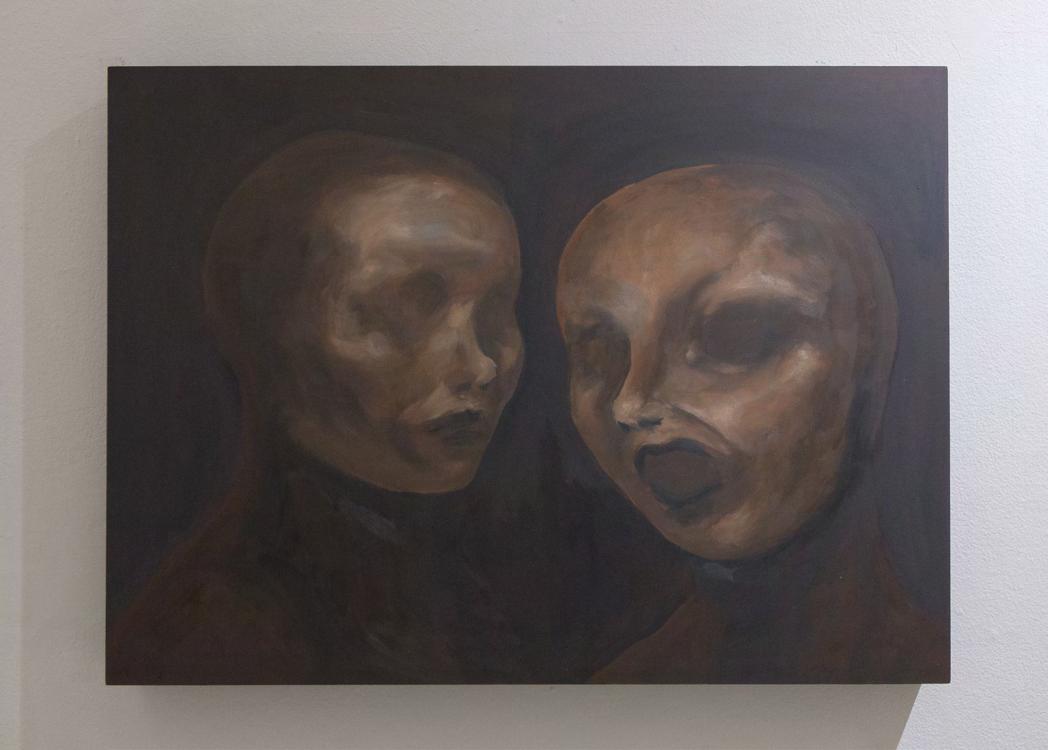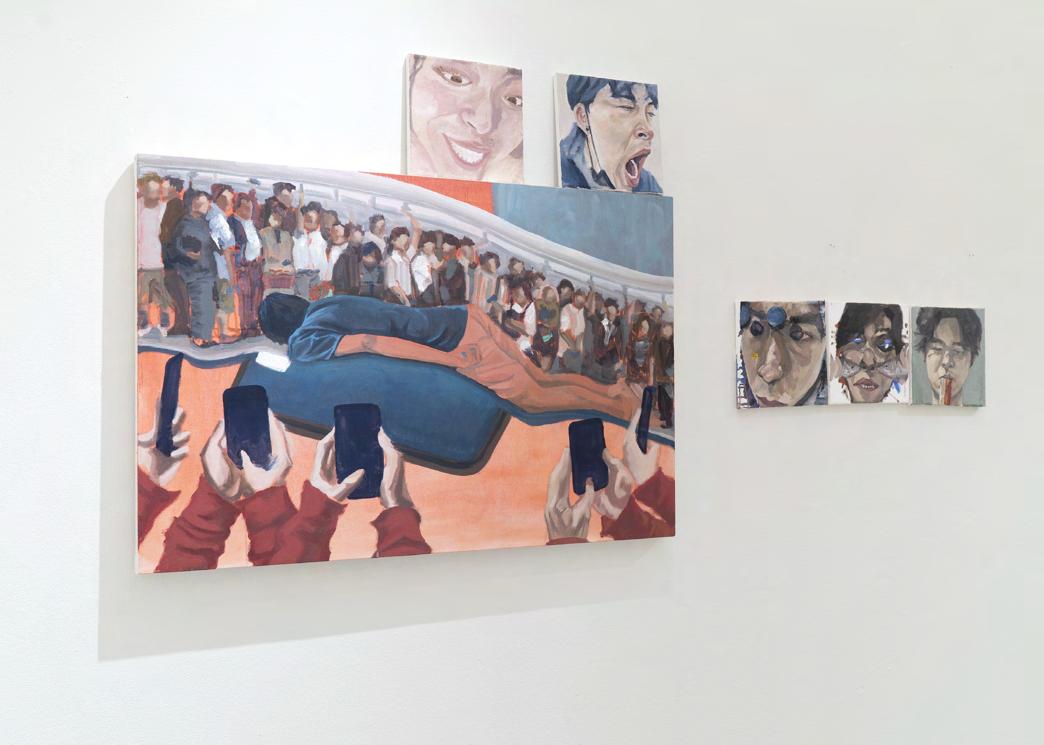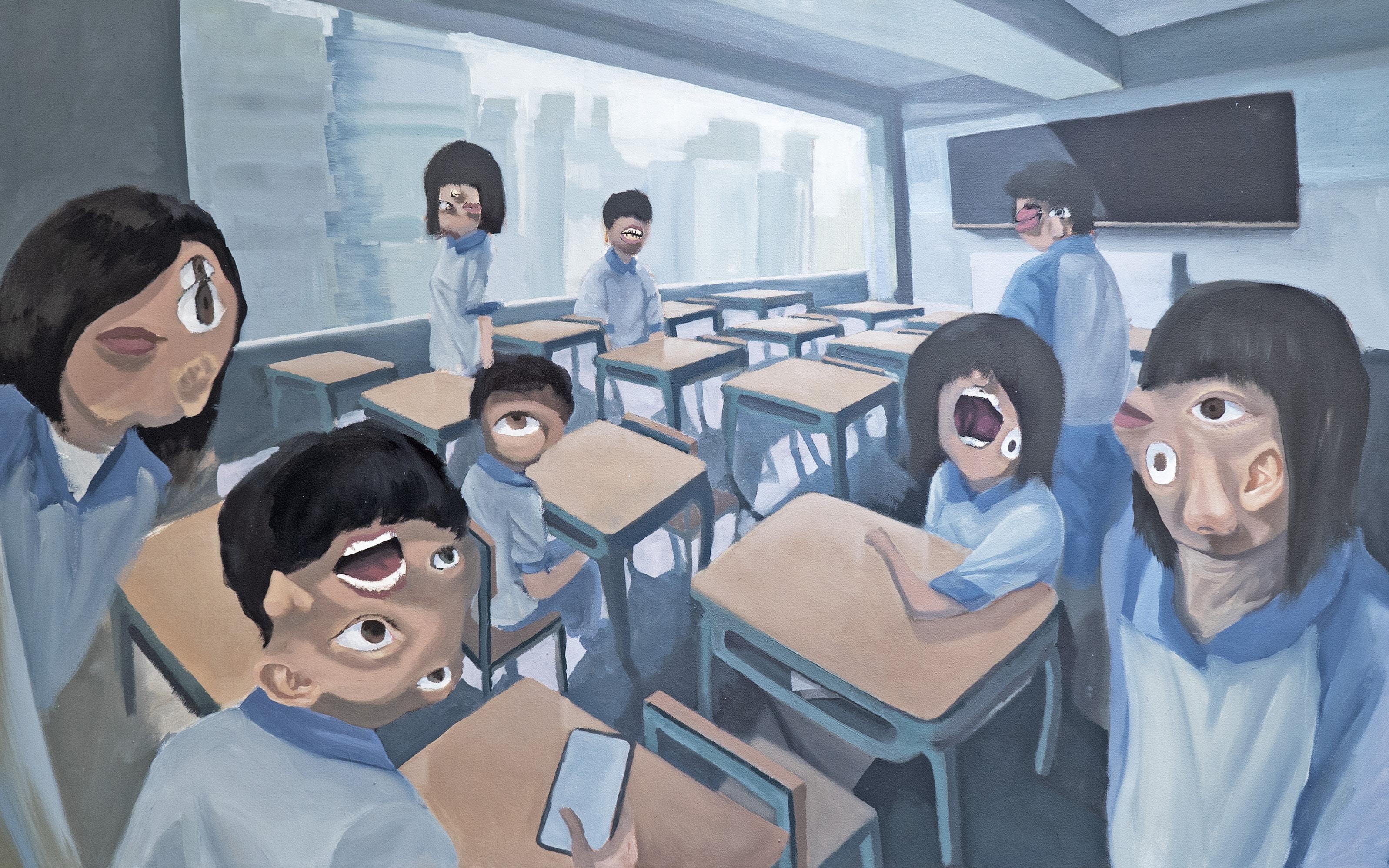 The surrealistic pink-and-gray floating horse head paintings of Shengjie Jiang. Giorgio de Chirico and Leonora Carrington serve as precedents for the nearby architectures of Christian Kwon and floating baby heads (with gravitational pulls) of Shirley Yi Li. The enlarged mushroom and insect sculptures of Ziyao Xie appear like a scene from Alice in Wonderland. Faces painted by Lizhang Li have swapped eyes and mouths, disturbing an otherwise banal classroom scene. I’ve always taken André Breton’s project as an exercise of world-building out of the wreckage of World War I (an earlier era of polycrisis?), and I see these artists taking a cue from the Frenchman in their impulses to visually interpret the hypnagogic past few years. But it hasn’t just been COVID-19 that’s felt dreamlike.