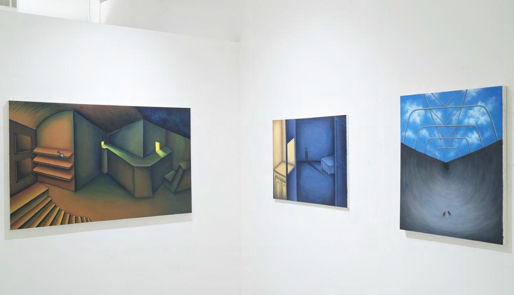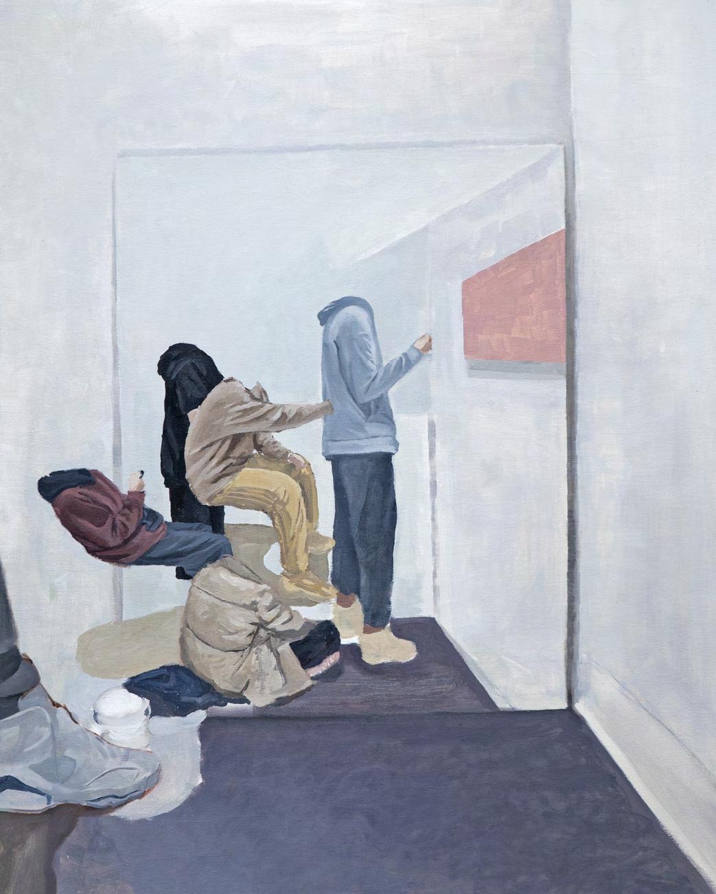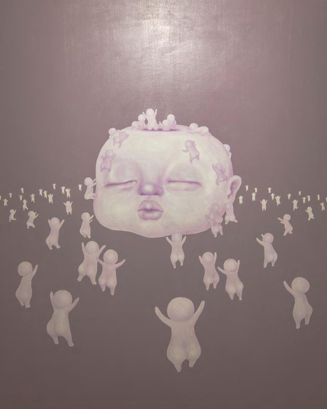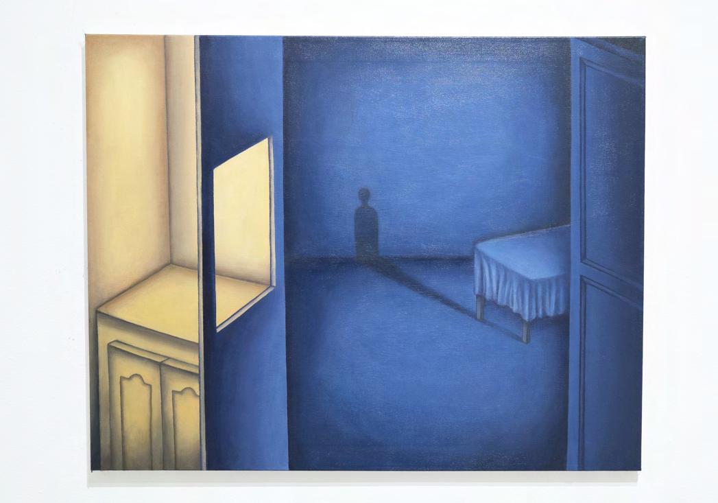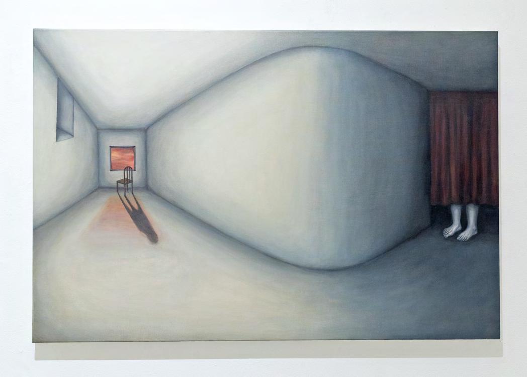 The surrealistic pink-and-gray floating horse head paintings of Shengjie Jiang. Giorgio de Chirico and Leonora Carrington serve as precedents for the nearby architectures of Christian Kwon and floating baby heads (with gravitational pulls) of Shirley Yi Li. The enlarged mushroom and insect sculptures of Ziyao Xie appear like a scene from Alice in Wonderland. Faces painted by Lizhang Li have swapped eyes and mouths, disturbing an otherwise banal classroom scene. I’ve always taken André Breton’s project as an exercise of world-building out of the wreckage of World War I (an earlier era of polycrisis?), and I see these artists taking a cue from the Frenchman in their impulses to visually interpret the hypnagogic past few years. But it hasn’t just been COVID-19 that’s felt dreamlike.