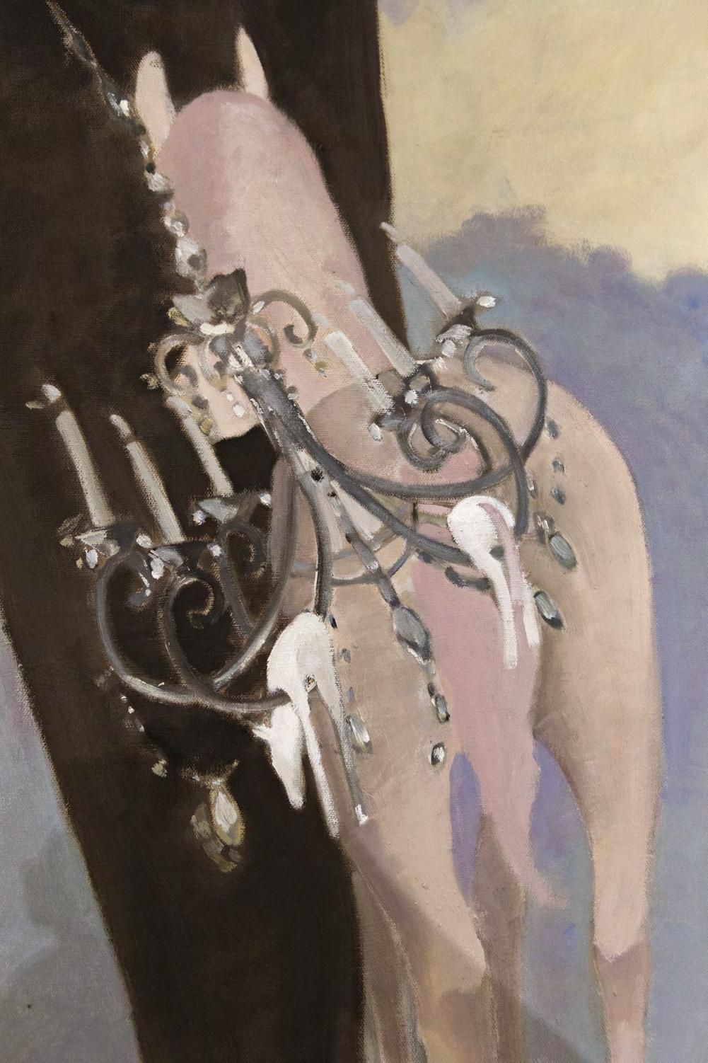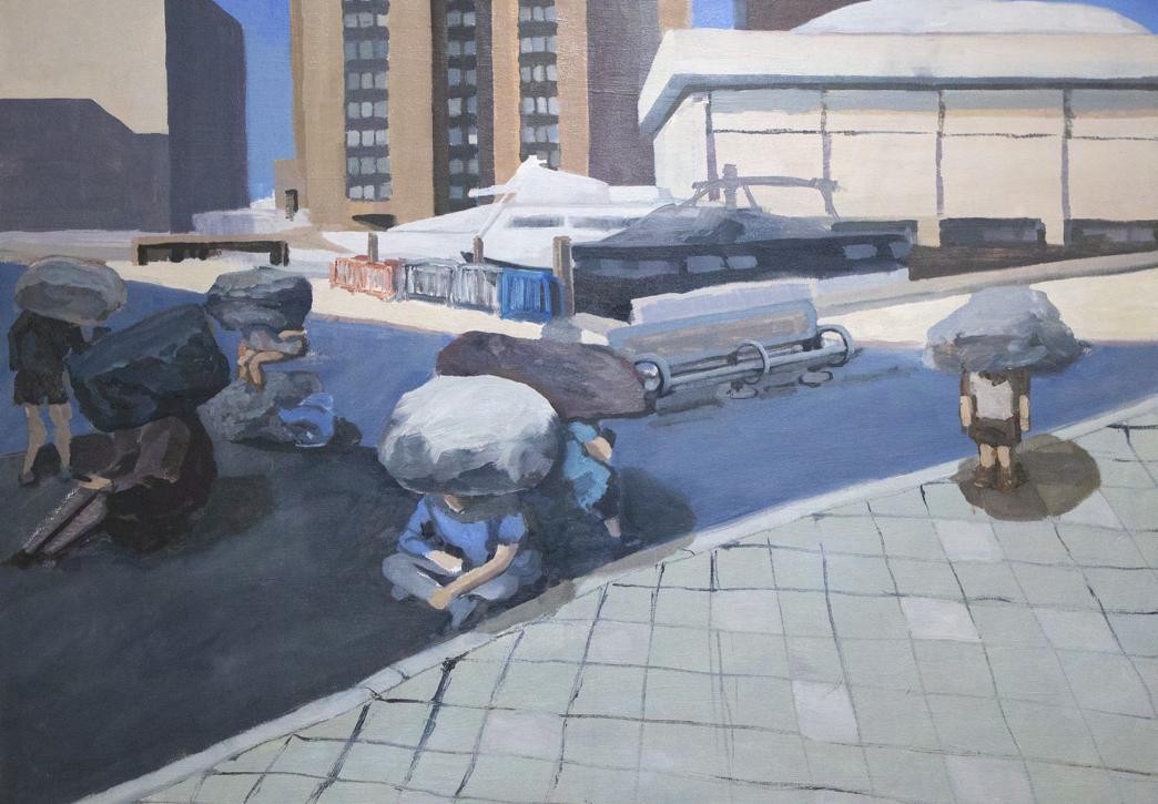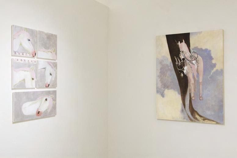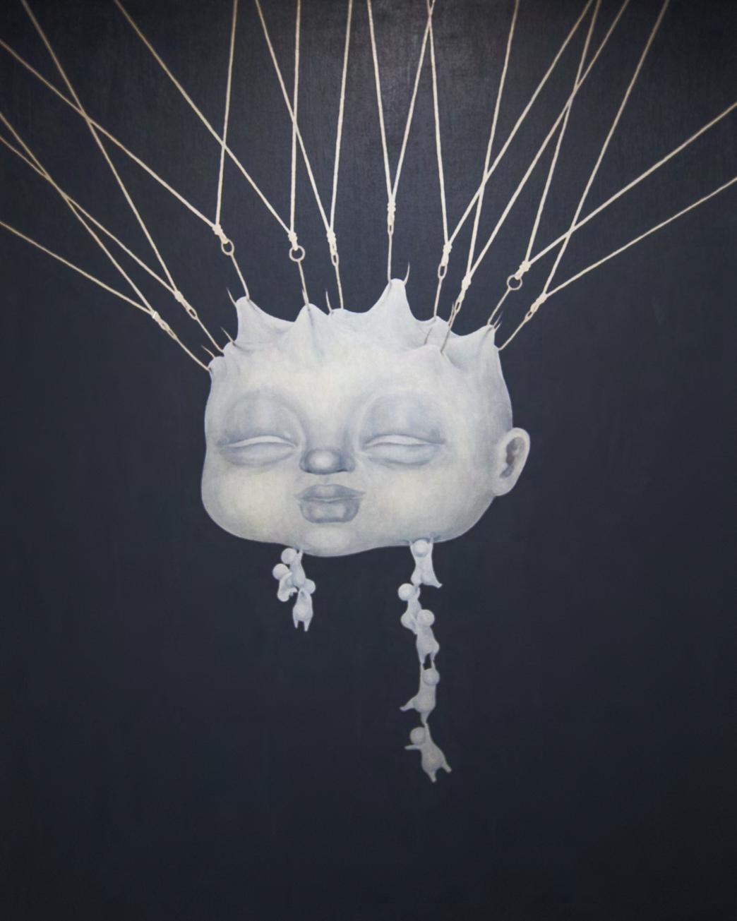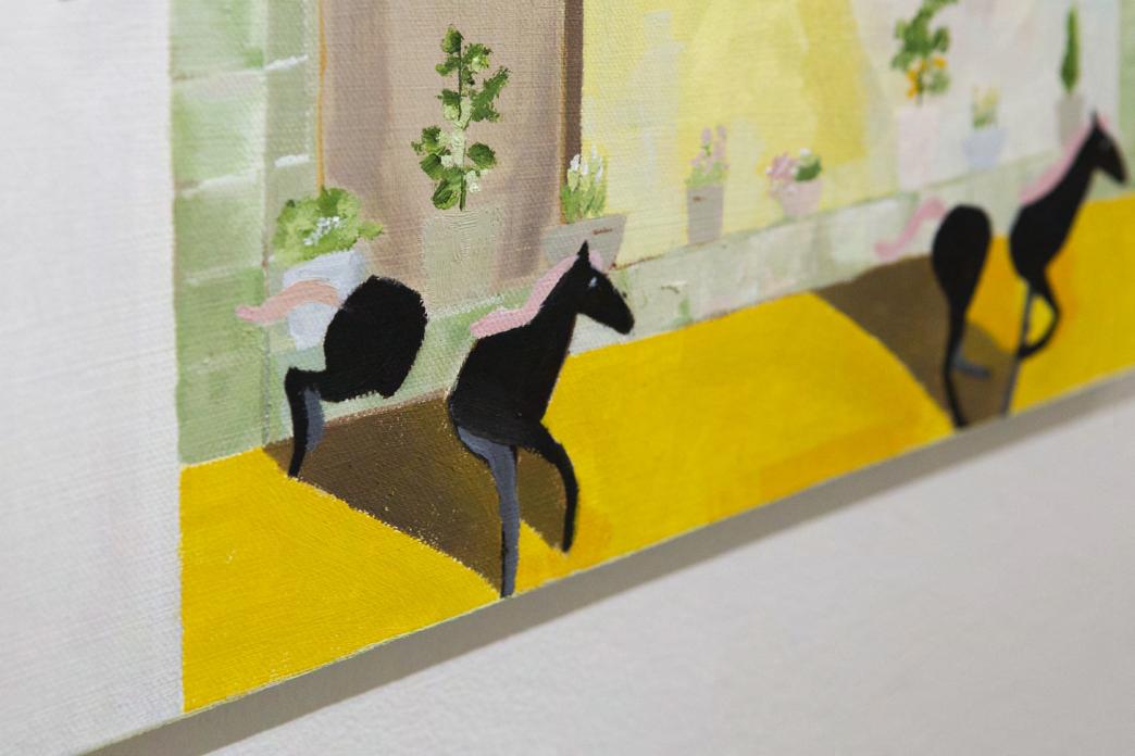 The surrealistic pink-and-gray floating horse head paintings of Shengjie Jiang. Giorgio de Chirico and Leonora Carrington serve as precedents for the nearby architectures of Christian Kwon and floating baby heads (with gravitational pulls) of Shirley Yi Li. The enlarged mushroom and insect sculptures of Ziyao Xie appear like a scene from Alice in Wonderland. Faces painted by Lizhang Li have swapped eyes and mouths, disturbing an otherwise banal classroom scene. I’ve always taken André Breton’s project as an exercise of world-building out of the wreckage of World War I (an earlier era of polycrisis?), and I see these artists taking a cue from the Frenchman in their impulses to visually interpret the hypnagogic past few years. But it hasn’t just been COVID-19 that’s felt dreamlike.