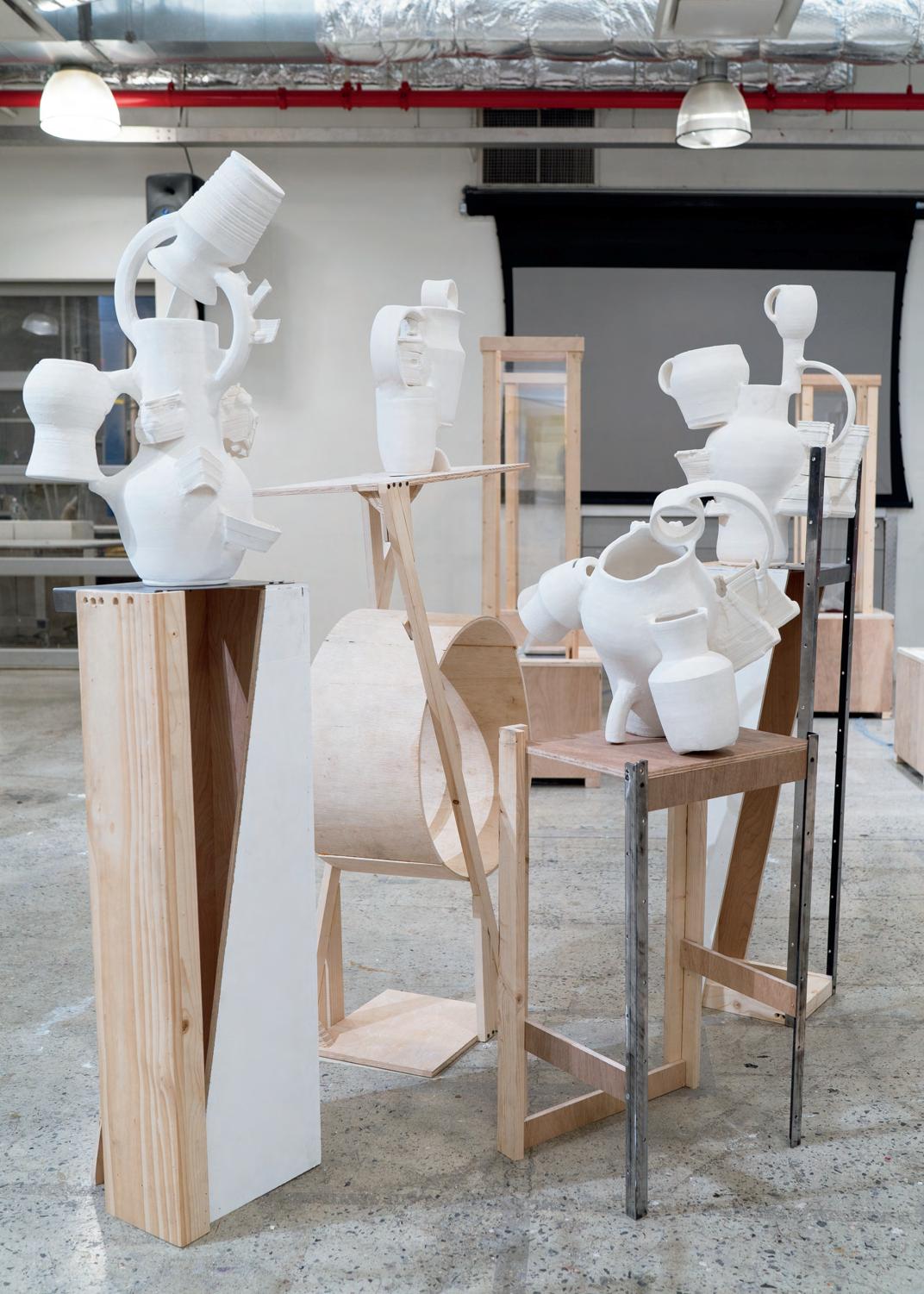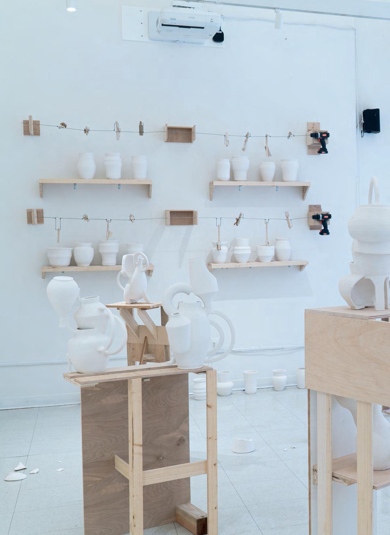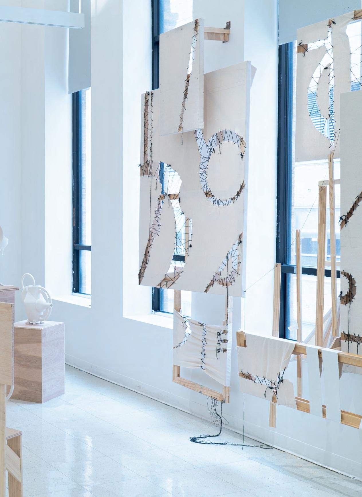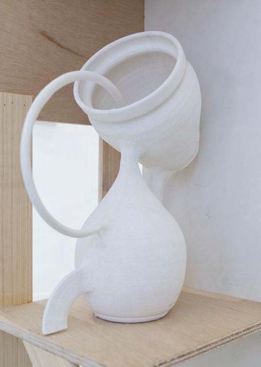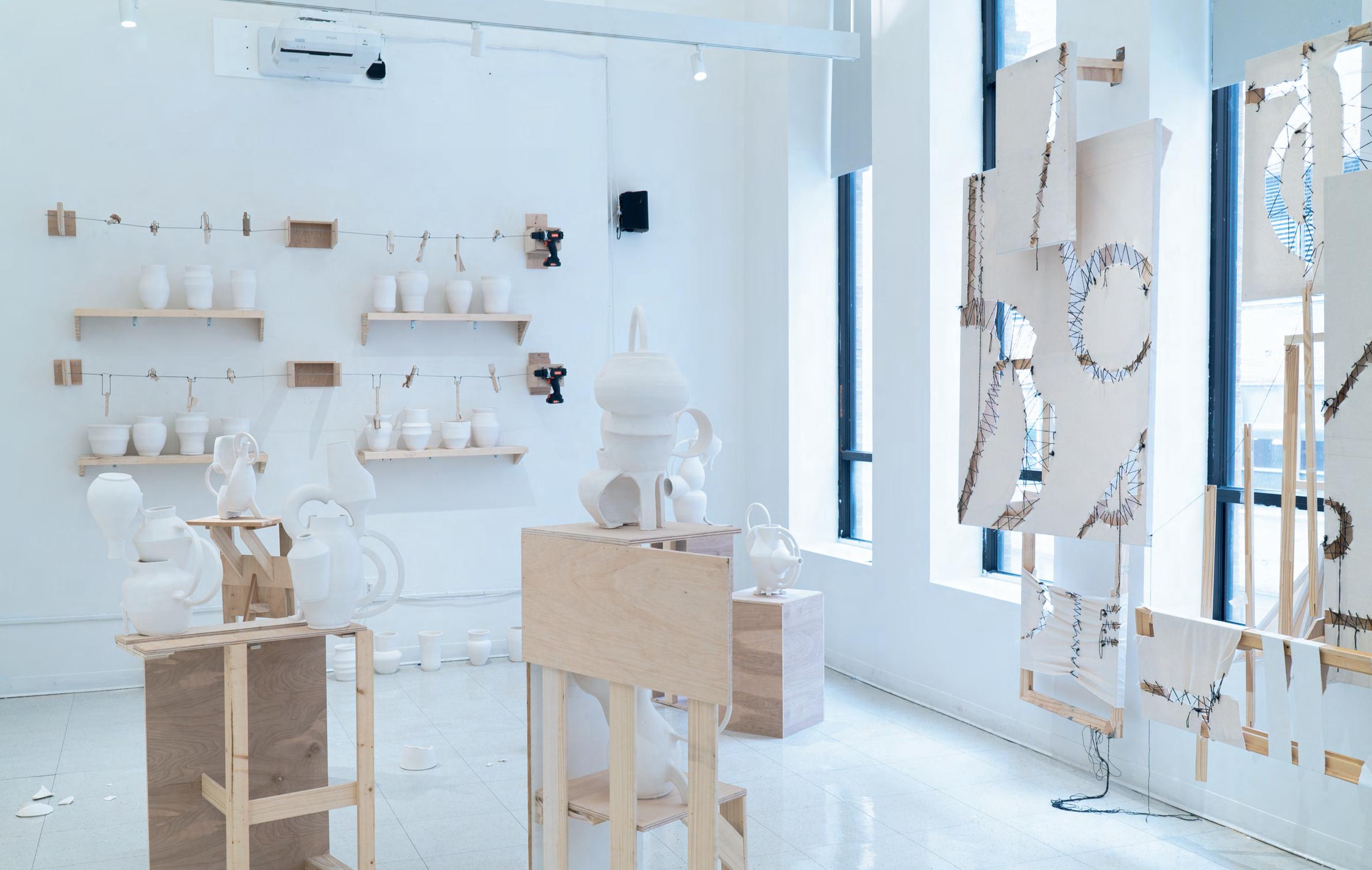 When I encountered Ryan Yu’s ceramics, I was puzzled by their familiar shapes but clear inutility. I learned the vases and pitchers had been generated using artificial intelligence—the ubiquity of such technology I’m sure will be felt even more by the time this essay is printed. These sculptures are elegant experiments that seemed prescient of an AI-generated reality where everyday objects are all slightly off. For a generation raised on the Internet, there was a surprising affinity for traditional media. Though some works—like those of Qiqi Pan that use string and clay to create a ruddy web resembling neural pathways or abstracted social networks—are harnessed in tech. Or Yali Reichman’s wall works that appear to bring digital models to a minimalist sculptural aesthetic. Or Cheyenne Preston’s large design sketch of a file cabinet on anachronistically fibrous canvas. These are works acknowledging a world online, yet their makers clearly desire the physicality of material-based practices.