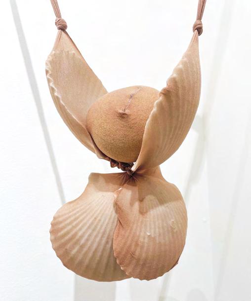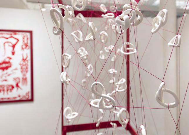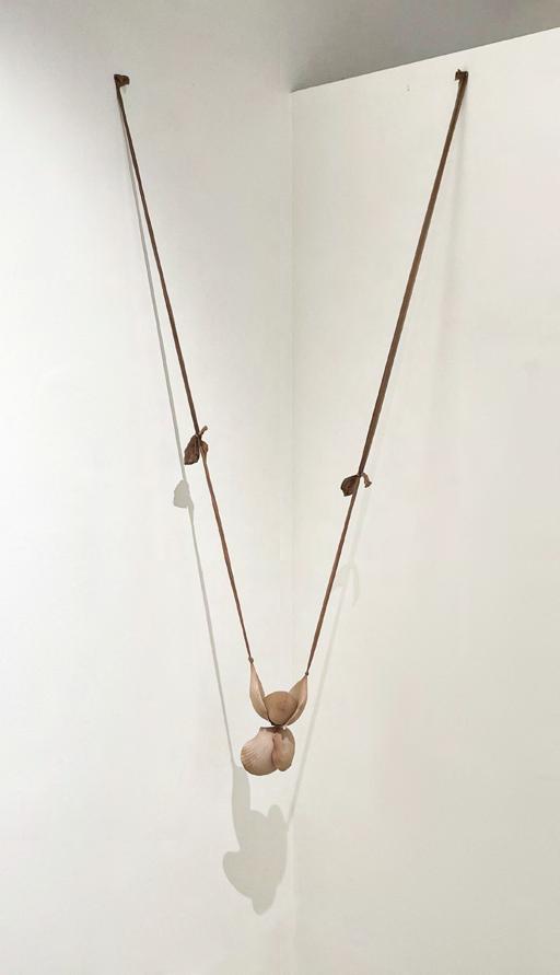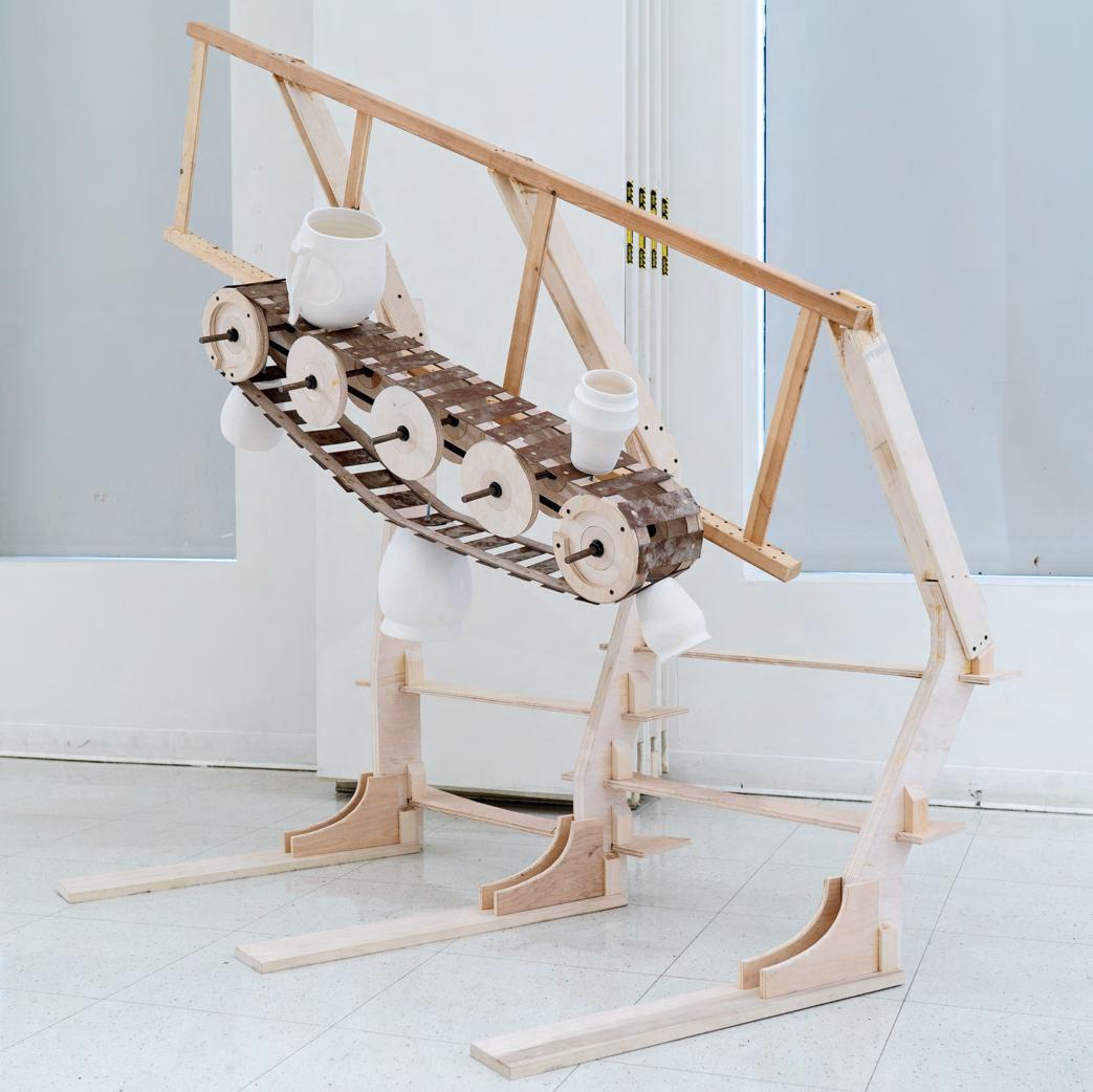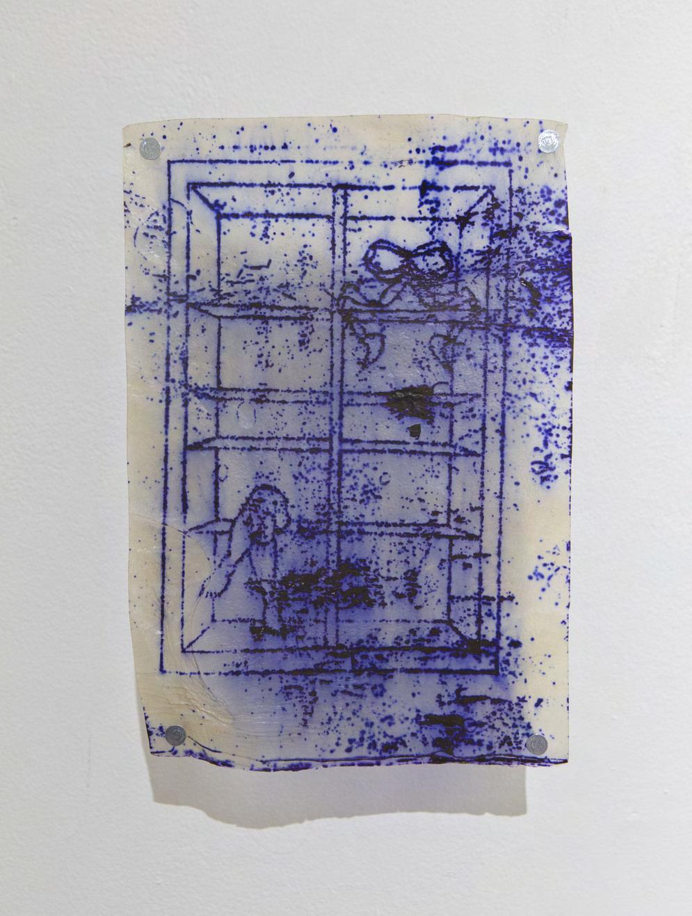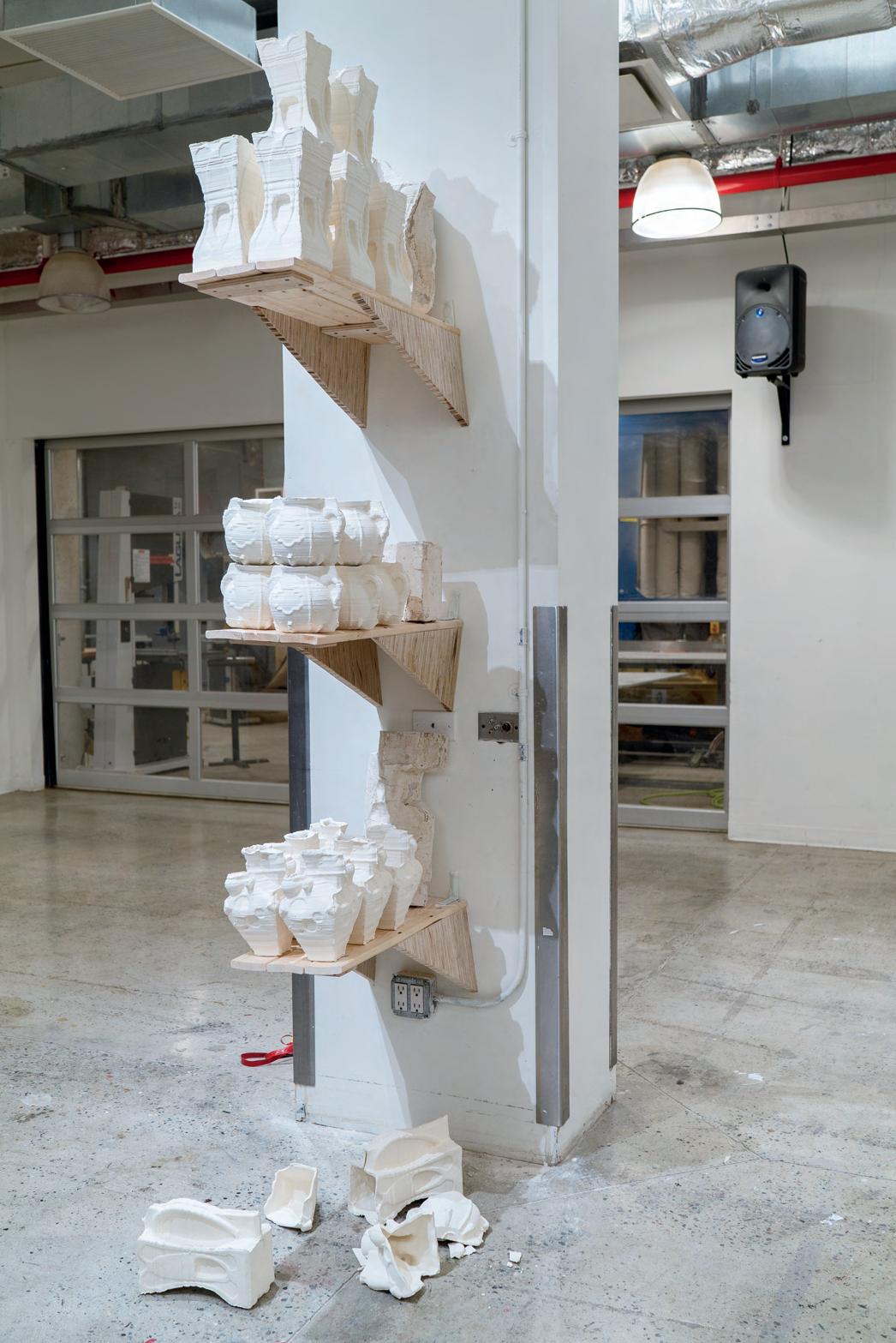 When I encountered Ryan Yu’s ceramics, I was puzzled by their familiar shapes but clear inutility. I learned the vases and pitchers had been generated using artificial intelligence—the ubiquity of such technology I’m sure will be felt even more by the time this essay is printed. These sculptures are elegant experiments that seemed prescient of an AI-generated reality where everyday objects are all slightly off. For a generation raised on the Internet, there was a surprising affinity for traditional media. Though some works—like those of Qiqi Pan that use string and clay to create a ruddy web resembling neural pathways or abstracted social networks—are harnessed in tech. Or Yali Reichman’s wall works that appear to bring digital models to a minimalist sculptural aesthetic. Or Cheyenne Preston’s large design sketch of a file cabinet on anachronistically fibrous canvas. These are works acknowledging a world online, yet their makers clearly desire the physicality of material-based practices.