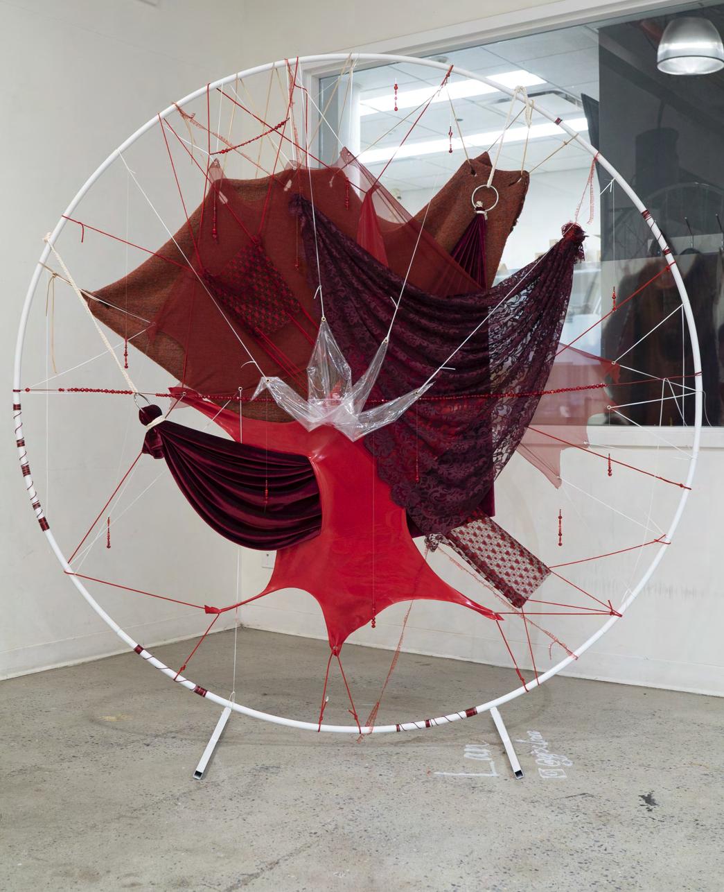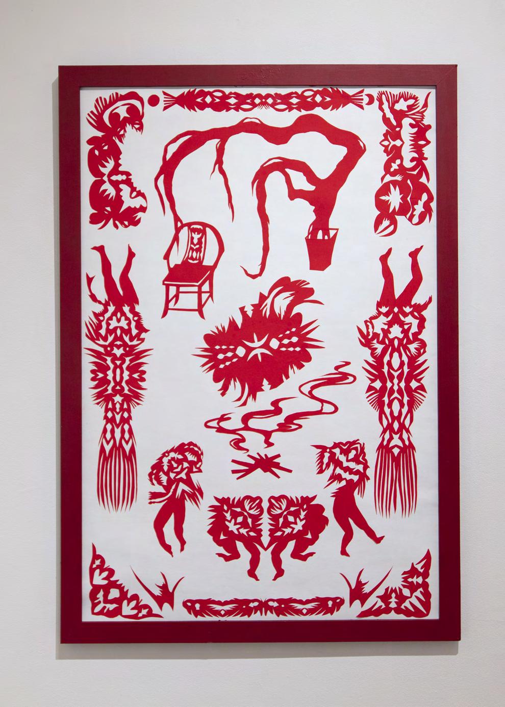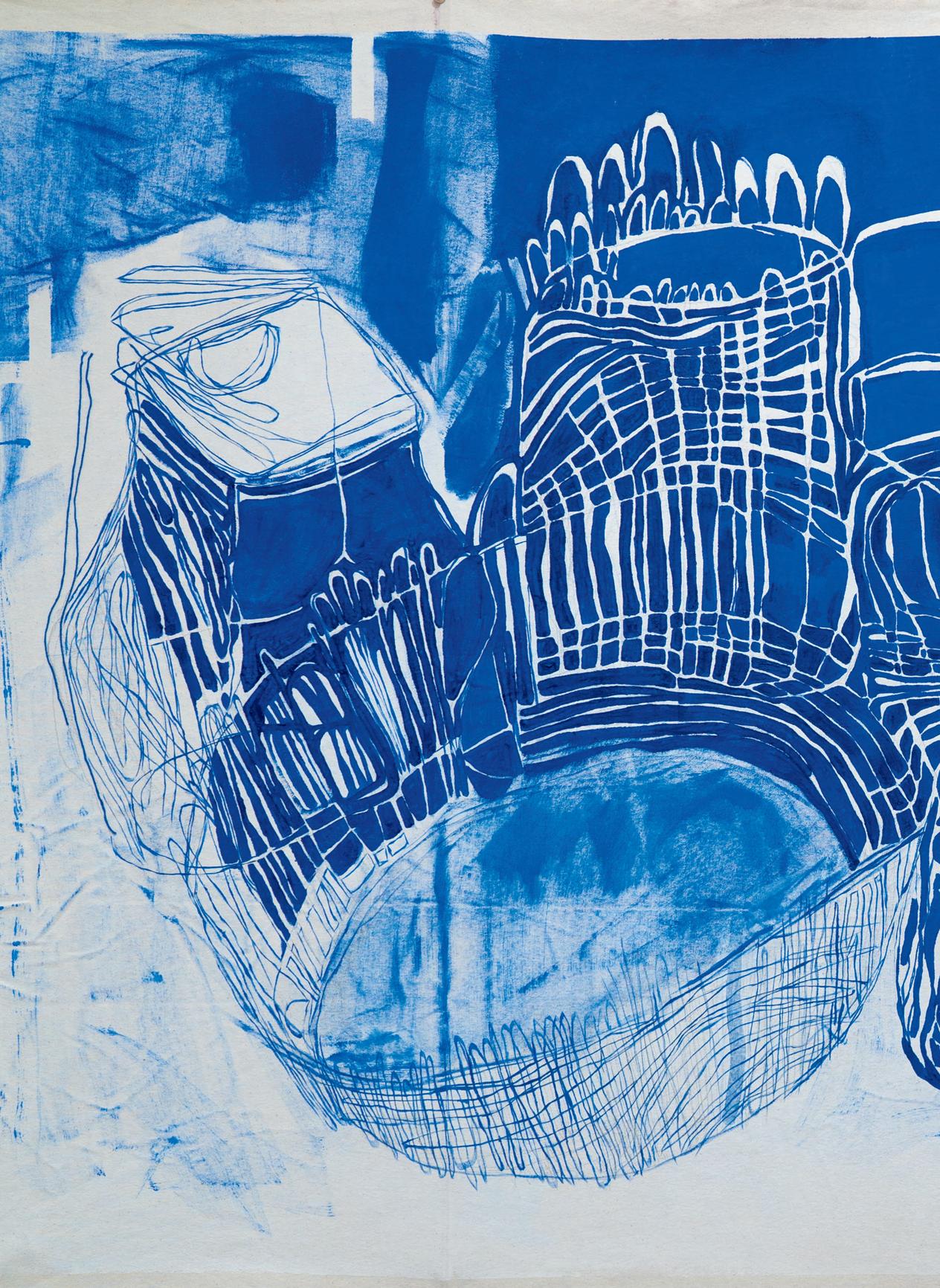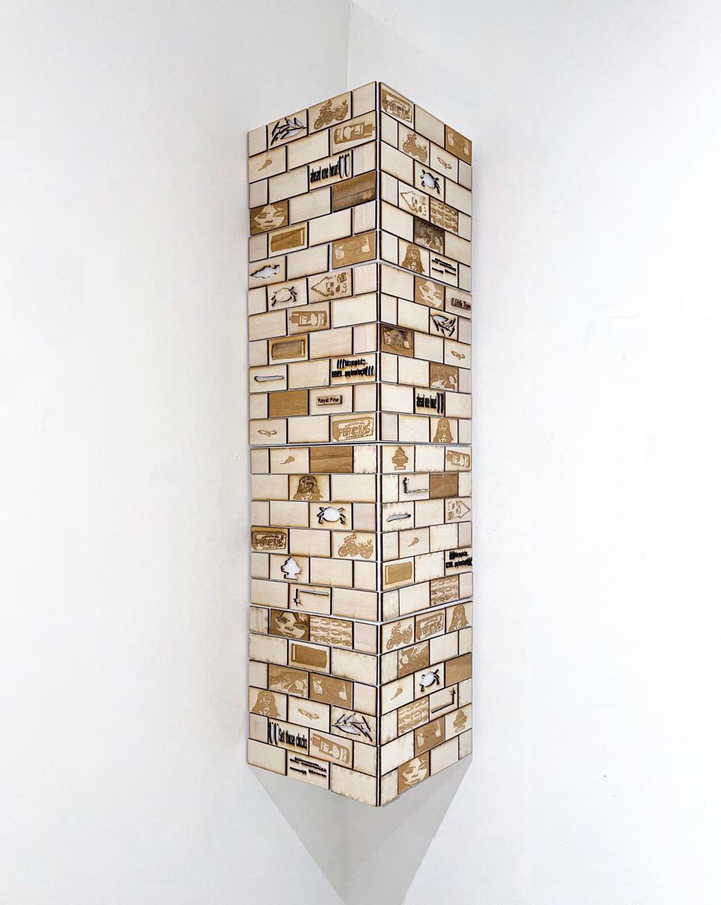 When I encountered Ryan Yu’s ceramics, I was puzzled by their familiar shapes but clear inutility. I learned the vases and pitchers had been generated using artificial intelligence—the ubiquity of such technology I’m sure will be felt even more by the time this essay is printed. These sculptures are elegant experiments that seemed prescient of an AI-generated reality where everyday objects are all slightly off. For a generation raised on the Internet, there was a surprising affinity for traditional media. Though some works—like those of Qiqi Pan that use string and clay to create a ruddy web resembling neural pathways or abstracted social networks—are harnessed in tech. Or Yali Reichman’s wall works that appear to bring digital models to a minimalist sculptural aesthetic. Or Cheyenne Preston’s large design sketch of a file cabinet on anachronistically fibrous canvas. These are works acknowledging a world online, yet their makers clearly desire the physicality of material-based practices.