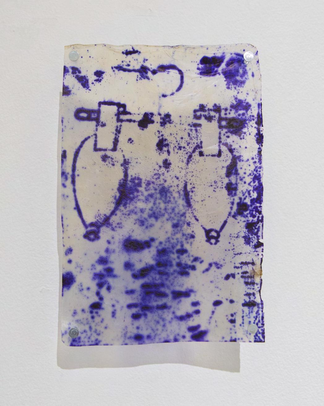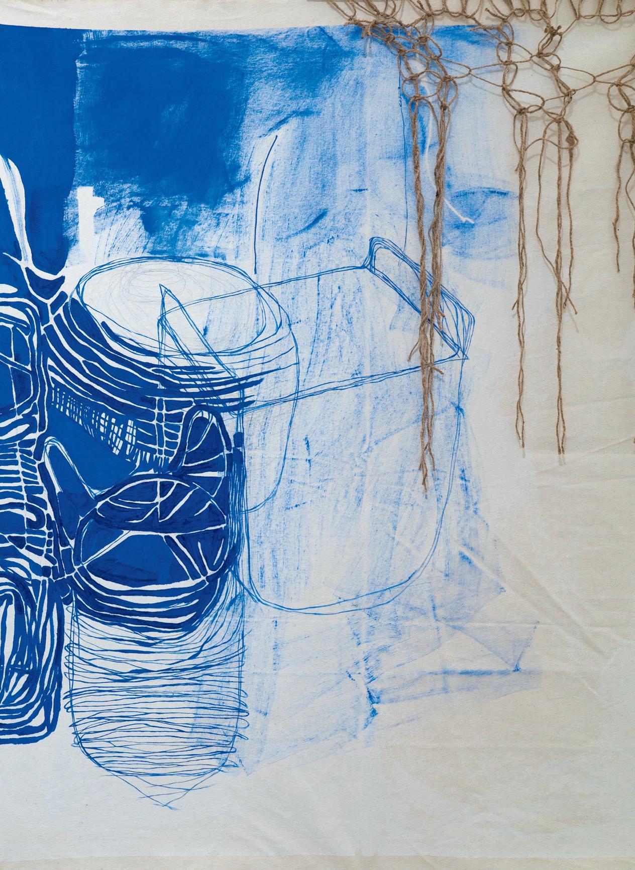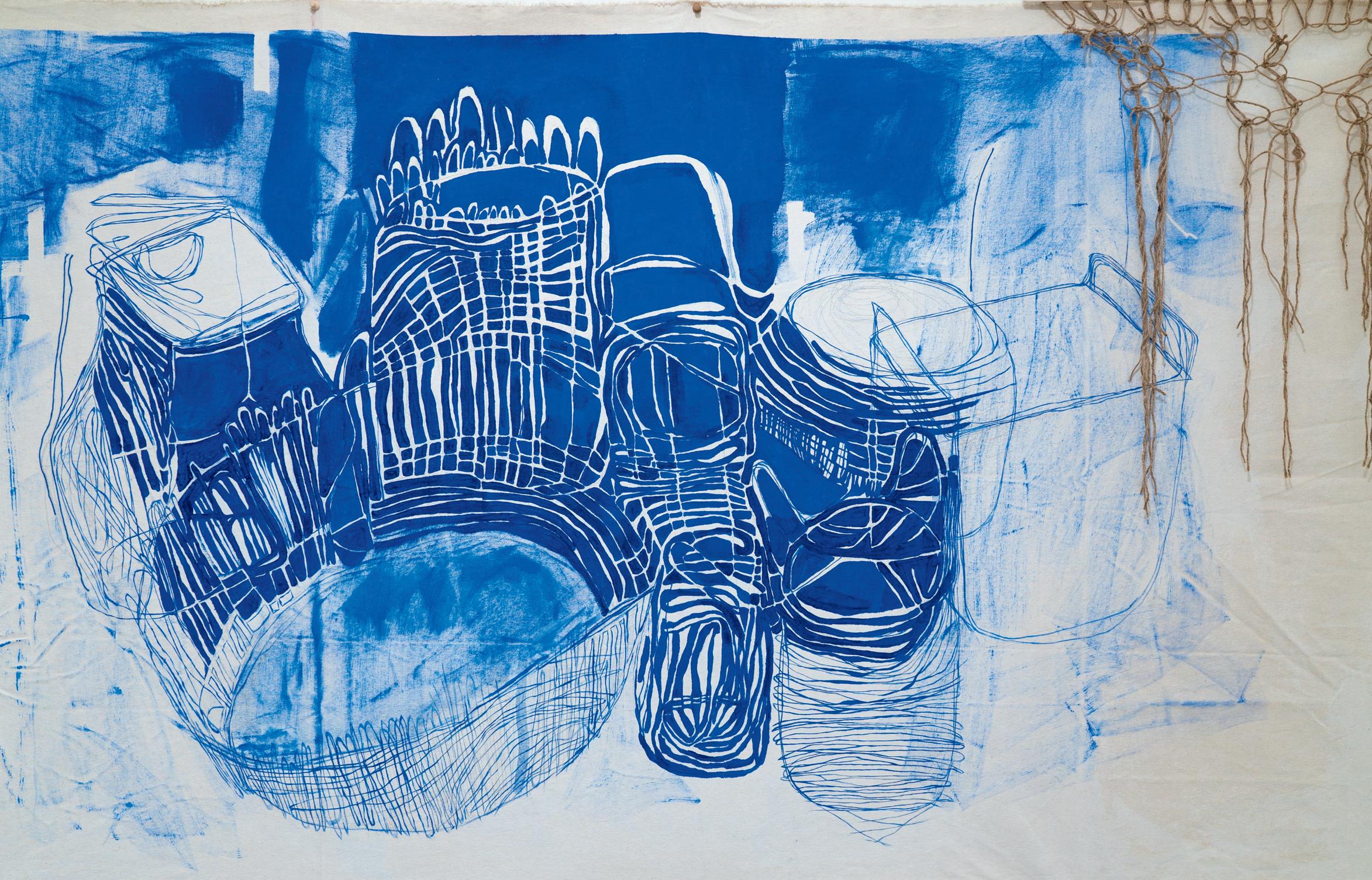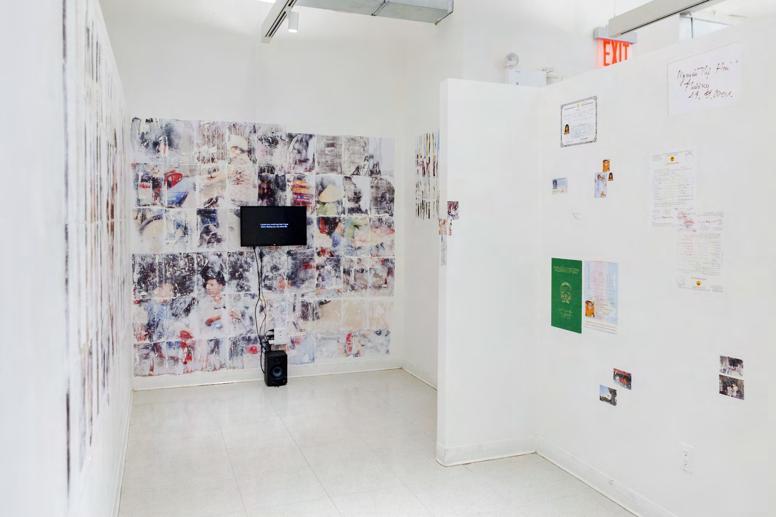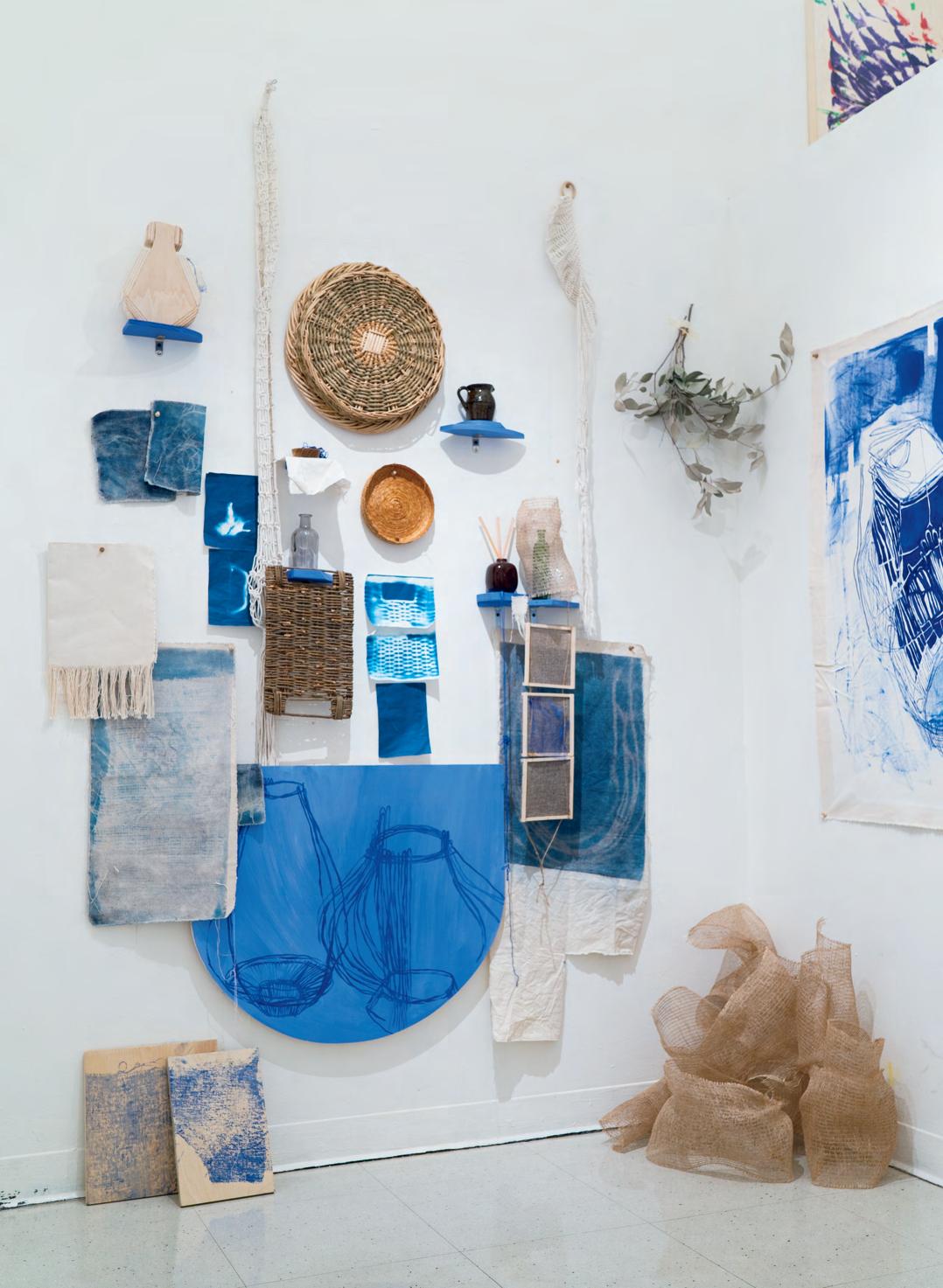Others look back, perhaps as a way to anticipate what’s next. In adjacent galleries were document-based installations by Blush Berrios, Liv McGuinness and Basharat Ali Syed. These artists take the ephemera of a lived experience and craft narratives about ancestry and family trauma. Especially personal was McGuinness’s juxtaposition of documents that trace her birth in Vietnam to her upbringing by a white Long Island family. She deftly plays with cultural signifiers but also the complex emotions that come from both adoptees and immigrants. Similar to these projects is Rhesa Paul’s brilliant blue installation of jars and baskets that unites the personal and historical in a