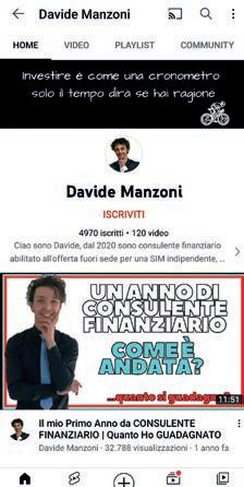 Davide Manzoni, consulente finanziario abilitato all’offerta fuori sede dal 2020, tramite il suo canale YouTube prova a portare le persone all’interno di questo mondo, applicando quello che ha imparato.