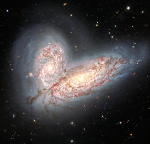 La fusione tra queste galassie è un’anteprima di ciò che accadrà quando la Via Lattea entrerà in collisione con la Galassia di Andromeda. Si stanno avvicinando alla velocità di 300 chilometri al secondo, ma niente paura: la fusione avverrà tra circa cinque miliardi di anni.