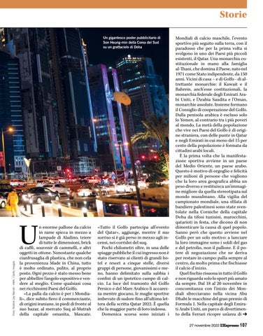 Ed è proprio tra vicini che per poco non scoppiava una lite: dal giugno 2017 al gennaio 2021 il Qatar è stato isolato con un embargo da parte di Arabia Saudita, Emirati Arabi, Bahrein ed Egitto che lo accusavano di sostene re il terrorismo e aver troppi legami con Iran e Turchia. Quest’ultimi due non l’hanno mollato nella crisi diplo matica, da cui è uscito più forte che mai. Il 20 novembre il giovane prin cipe Mohammed Bin Salman, il più autoritario e controverso dei principi del Golfo, è volato a Doha per la ce rimonia di apertura dei Mondiali. Tri sta quella casa dove non entran mai vicini. Del resto le partite di calcio si guardano sempre insieme.