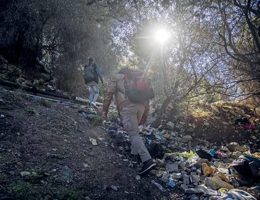 Qui sopra, l’accampamento dei migranti in transito nei pressi del cimitero di Ventimiglia. Le ong denunciano le pessime condizioni in cui si trovano a vivere