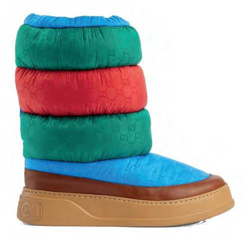 Nella sua ultima collezione, Gucci reinterpreta il nylon per creare design ibridi che mescolano influenze diverse. I doposci da uomo sono realizzati in nylon GG jacquard multicolor. € 890 gucci.com