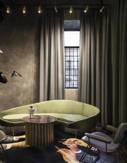 pena dopo a Largo di Torre Argentina e con il Tevere a pochi metri. Camminando si nota a malapena, dai toni scuri, gli infissi massicci, il velluto a terra così come negli arredi e una palazzina un po’schiacciata tra gli edifici un tempo sedi di laboratori, magazzini, botteghe. Ancora oggi questa zona è un reticolato di insegne storiche e piccoli negozi (Roscioli si trova letteralmente a tre minuti a piedi, Campo dei Fiori a cinque così come l’osteria Al Pompiere dall’altro lato), più o meno battuti dai turisti ma ancora capaci di trasudare italianità. L’atmosfera è quella di un boutique hotel urban-chic, con una predilezione per gli spazi comuni, social, potenzialmente vissuti tutta la giornata dal cittadino così come dall’ospite. Ad aver pensato e realizzato questo concept è Marco Cilia, professionista con esperienza pluriennale nel mondo dell’ospitalità tra Stati Uniti e Inghilterra, rientrato in Italia proprio per lanciare questo suo nuovo brand. Un approccio poco conservativo rispetto alle tradizionali soluzioni romane e che punta piuttosto all’underground e all’arte contemporanea, coinvolgendo artisti, DJ, designers da tutto il mondo che infatti hanno disegnato parte degli oggetti e degli arredi comprese le palette cromatiche. L’approccio e l’impianto della comunicazione di questo boutique hotel consentono a chi segue da lontano di entrare a fondo nell’atmosfera Chapter, che strizza l’occhio al made in Italy con un tocco in più di glam e fascino.
