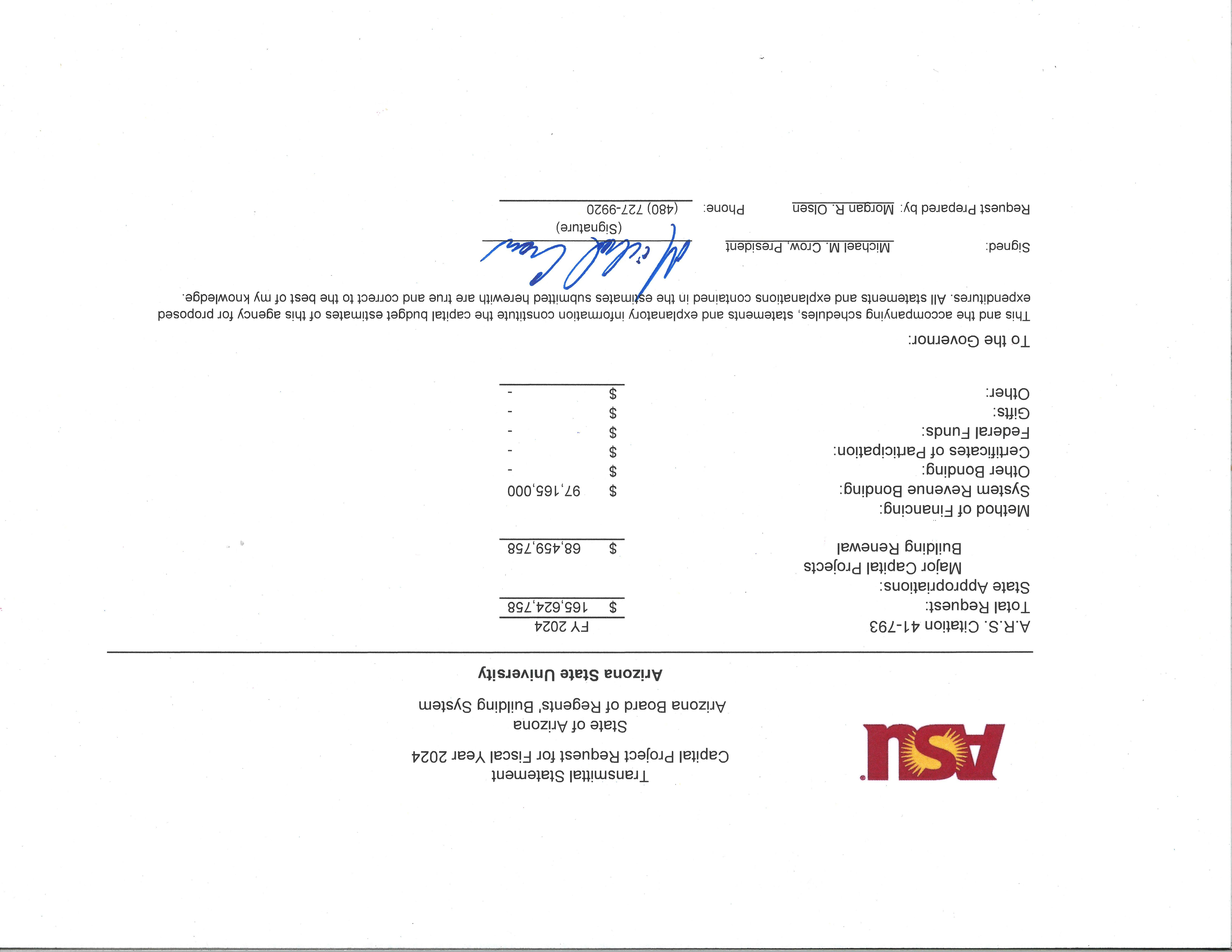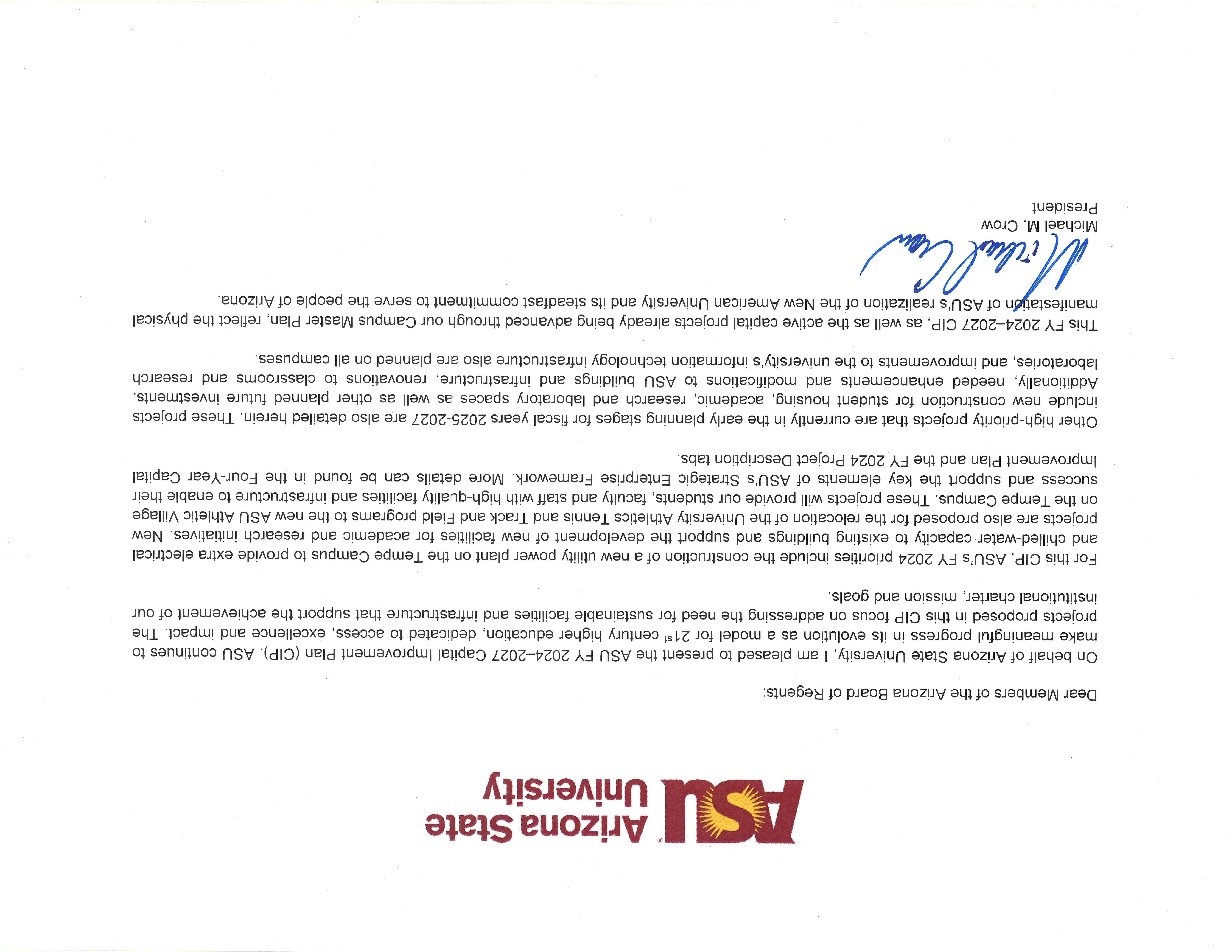 Arizona State University FY 2024–2027 Capital Improvement Plan Transmittal Statement