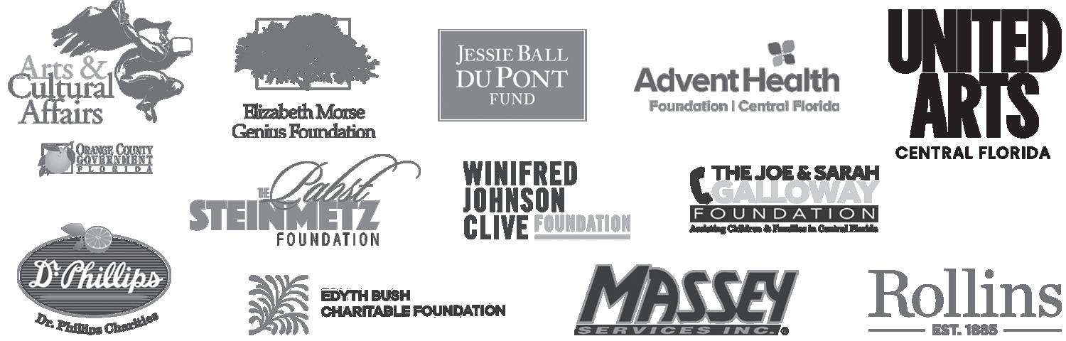 Our 90th Season is supported by many generous individual donors as well as Orange County Government through the Arts & Cultural Affairs program; United Arts of Central Florida, your local agency for the arts; Elizabeth Morse Genius Foundation; Dr. Phillips Charities; Jessie Ball duPont Fund; Pabst Steinmetz Foundation; Winifred Johnson Clive Foundation; AdventHealth, Edyth Bush Charitable Foundation; The Joe & Sarah Galloway Foundation; Massey Services Inc.; and Rollins College.