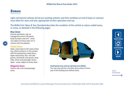 Zones Light commercial vehicles (LCVs) are working vehicles and their condition at end of lease or contract must allow for wear and tear, appropriate to their operation and use. The BVRLA Fair Wear & Tear Standard describes the condition of the vehicle in colour-coded zones, or areas, as detailed in the following pages. Blue Zone: