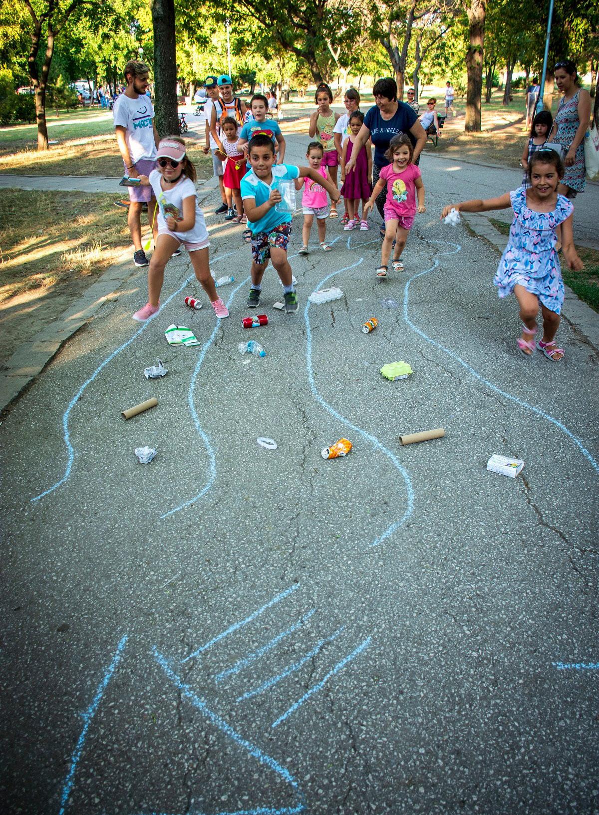Draw three stripes/trails on the ground with chalk and distribute an equal number of pieces of recyclable waste on each. At the end of the trails place two recycling trash cans (one for paper and one for plastic and metal). You may add a third bin/box, marked with the corresponding colour for glass, to increase the difficulty, but do not actually place glass packaging on the trails as there is a risk of breakage and cutting.