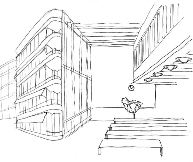 After the initial charette process with our clients, different aspects discovered from each member’s preliminary design were collected. This sketch shows the guidelines that were established by the clients and members of the studio for the final design.