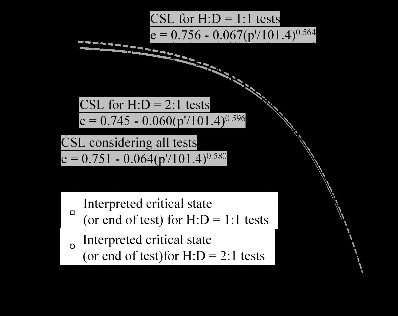 One of the principal benefits of testing specimens with H:D ratios of 1:1 over the more conventional 2:1 is that the CSL may be defined by testing either dense or loose, drained or undrained samples. In fact, when testing dense sand samples the use of specimens with a 1:1 H:D ratio is preferred, to improve the consistency of results to define the CSL.