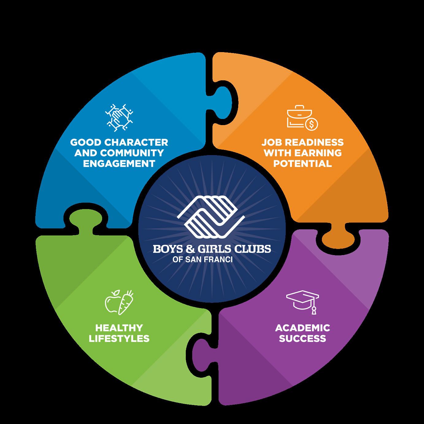 我们的“影响力公式”专注于四个关键领 域:学业成功、健康的生活方式、良好的品 格和社区参与,以及具备高收入潜力的职业 准备。我们的每个俱乐部和门多西诺营地都 采用“影响力公式”框架,以确保我们提供 高质量的体验,从而激励孩子们。