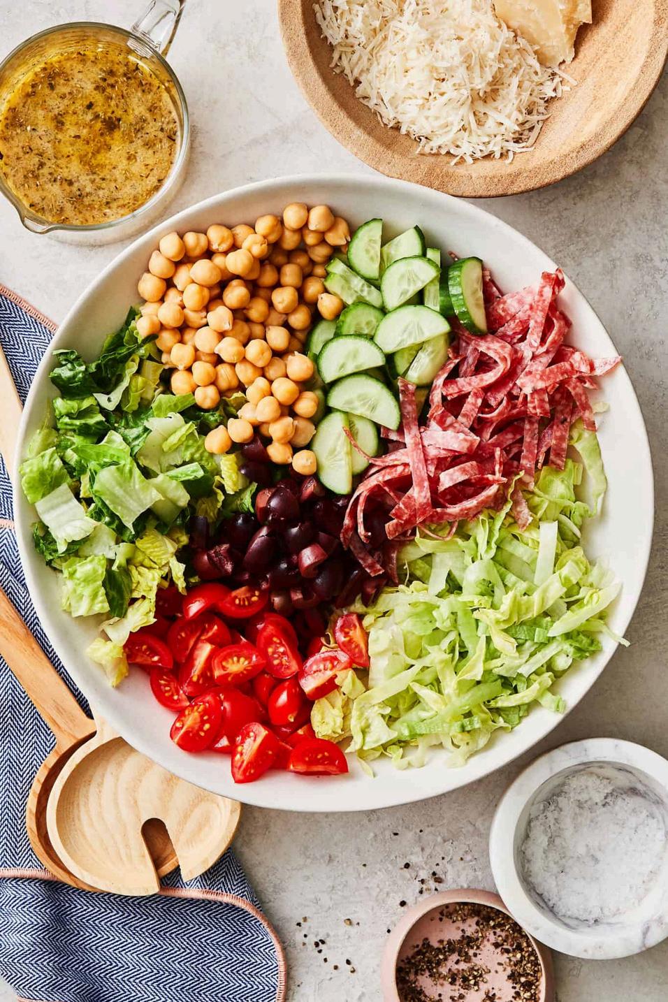 To make this salad, Whisk the dressing ingredients all together, in a small bowl, until they're fully combined. Taste and add additional seasonings, if desired. Next, chop your iceberg lettuce, romaine lettuce, Persian cucumbers, and salami, and add them to a large bowl alongside the garbanzo beans, olives, diced tomatoes, and grated parmesan cheese.