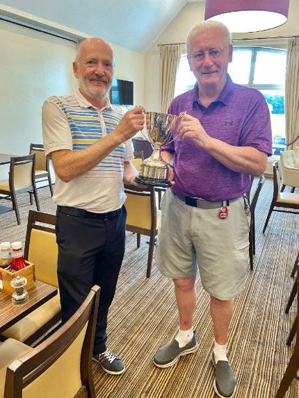 Winner for the second time for this event was James Miller with a truly “wow” round of golf. Playing off 9 he was 1 over gross playing the 18th a nervous double bogey didn’t affect a marvellous gross 74, net 65 and winner by some distance from many excellent scores on the day. Here are Jock and I awarding the distinctive trophy to James.