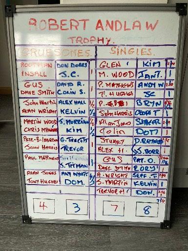 so honour’s even. The new renamed Robert Andlaw Trophy to be shared for 6 months. Some memorable moments such as Capt. Gus being dormy 3 down against Young Pat Oakes and pulling it back for a tie. Kelvin scoring a tremendous 48 Stableford points against his poor opponent who was giving away 29 shots - oh yeah, that was me. (John Martin)”