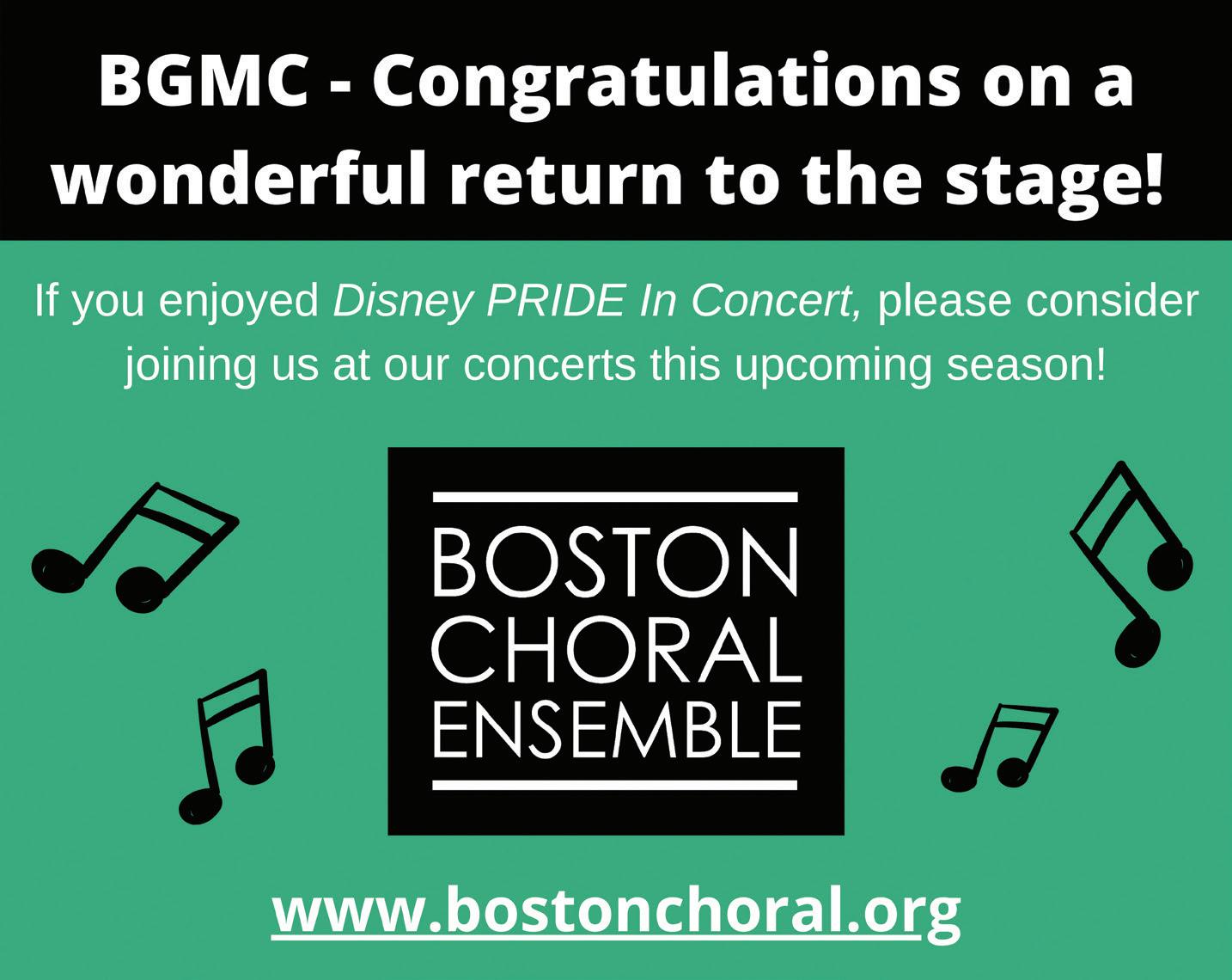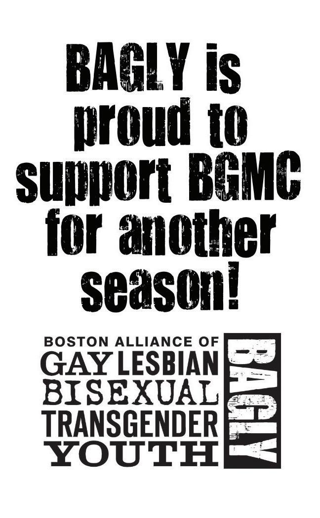 Bank of America recognizes Boston Gay Men’s Chorus for its success in bringing the arts to performers and audiences throughout the community. We commend you on creating an opportunity for all to enjoy and share a cultural experience. Visit us at bankofamerica.com/about.