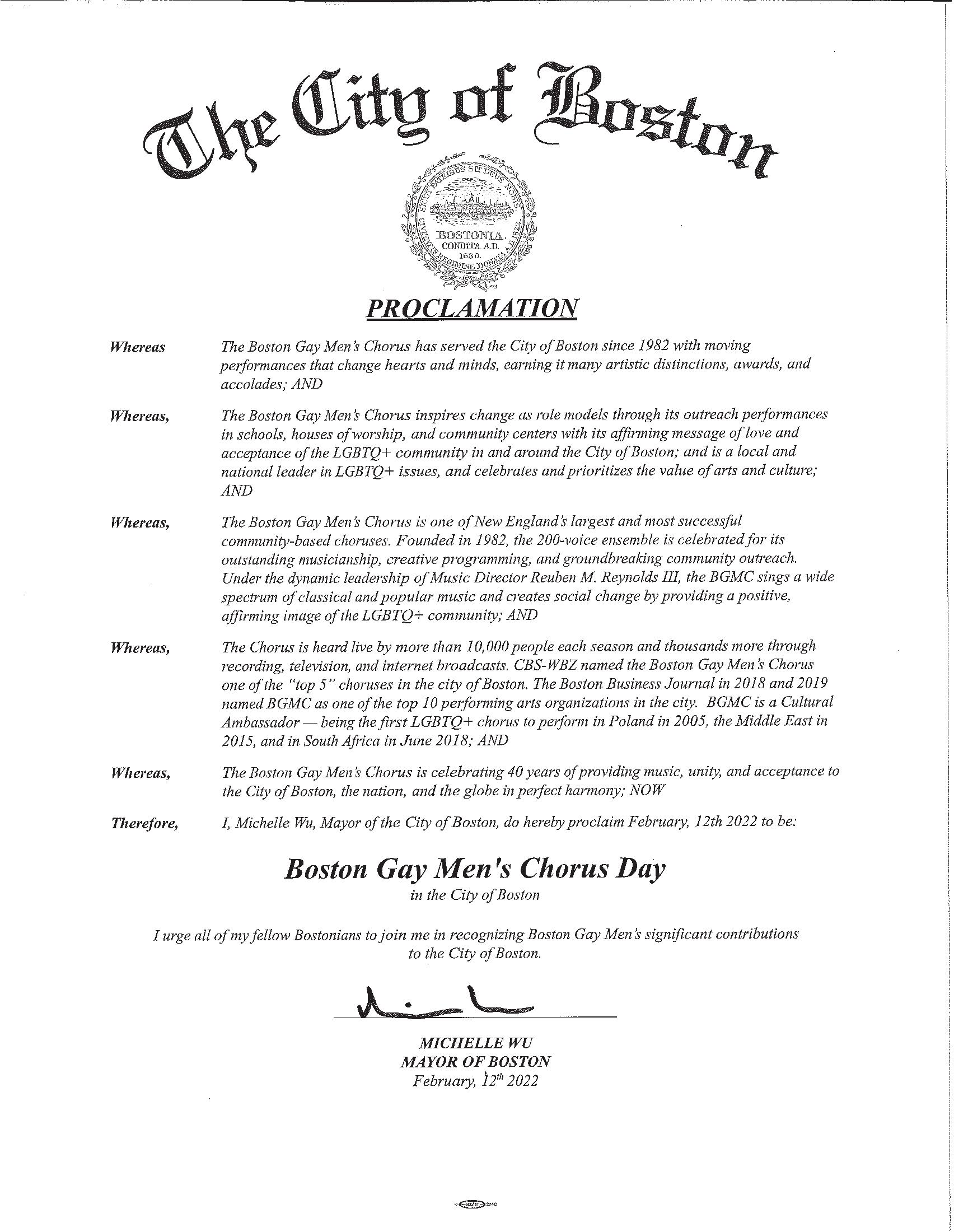 On behalf of the Commonwealth of Massachusetts, Lieutenant Governor Karyn Polito and I would like to congratulate the Boston Gay Men’s Chorus on your 40th anniversary