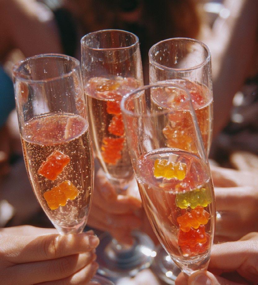 Bright, bubbly, and a little chaotic just like your first week at uni. Serve in plastic flutes with a gummy bear “swimming” inside. Sweet, cheerful, and Insta-worthy.