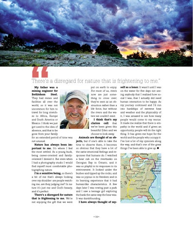 There’s a disregard for nature that is frightening to me.” My father was a mining engineer for Bethlehem Steel. They had mines and facilities all over the world, so it was not uncommon for him to travel for long stretches to Africa, Europe and South America or Mexico. I think we just got used to the idea of absence, and that to be gone from your family for an extended period of time was not unusual. Nature has always been important to me. It’s where I feel the most settled. As a young buck, being career-oriented and familyoriented I denied it. But even when I had a photography studio I would find myself most comfortable photographing nature. I’m a sensitive being, so there’s a bit of me that’s always looking over my shoulder: are people watching me, are they judging me? In nature it’s just me and God’s beauty, and it’s perfect. There’s a disregard for nature that is frightening to me. We’re not enjoying the gift that we were