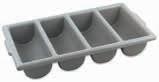 High density plastic (PP). 4 compartments. Seamless for easy cleaning. Odorless and noiseless. Can be used for storage of individually packaged condiments. Narrow for tight-space storage. Dishwasher safe. Sterilizes to commercial standards. Weight: 2.3 lbs. / 1 kg.