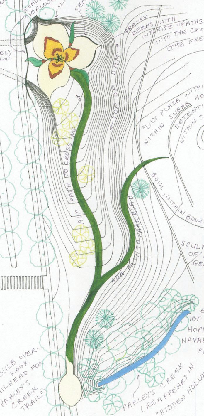 I attempted to emulate Johanson’s style to the fullest extent I could reasonably manage. I started simply: plucking a tulip poplar leaf from outsie our Jackson Street Studio, and tracing away. Soon, I was overlaying an aerial outline of the tennessee river to provide some flow, and abstracted butterfly wings to form the planting bed shapes.