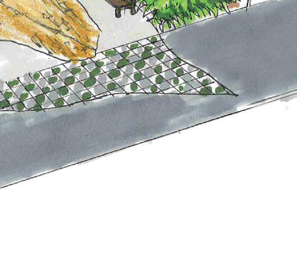 The leaf tips peeking onto the sidewalk was a probelm solved by the latticed permeable grass pavers, a product we learned about on a campus walk during our construction and materials class.