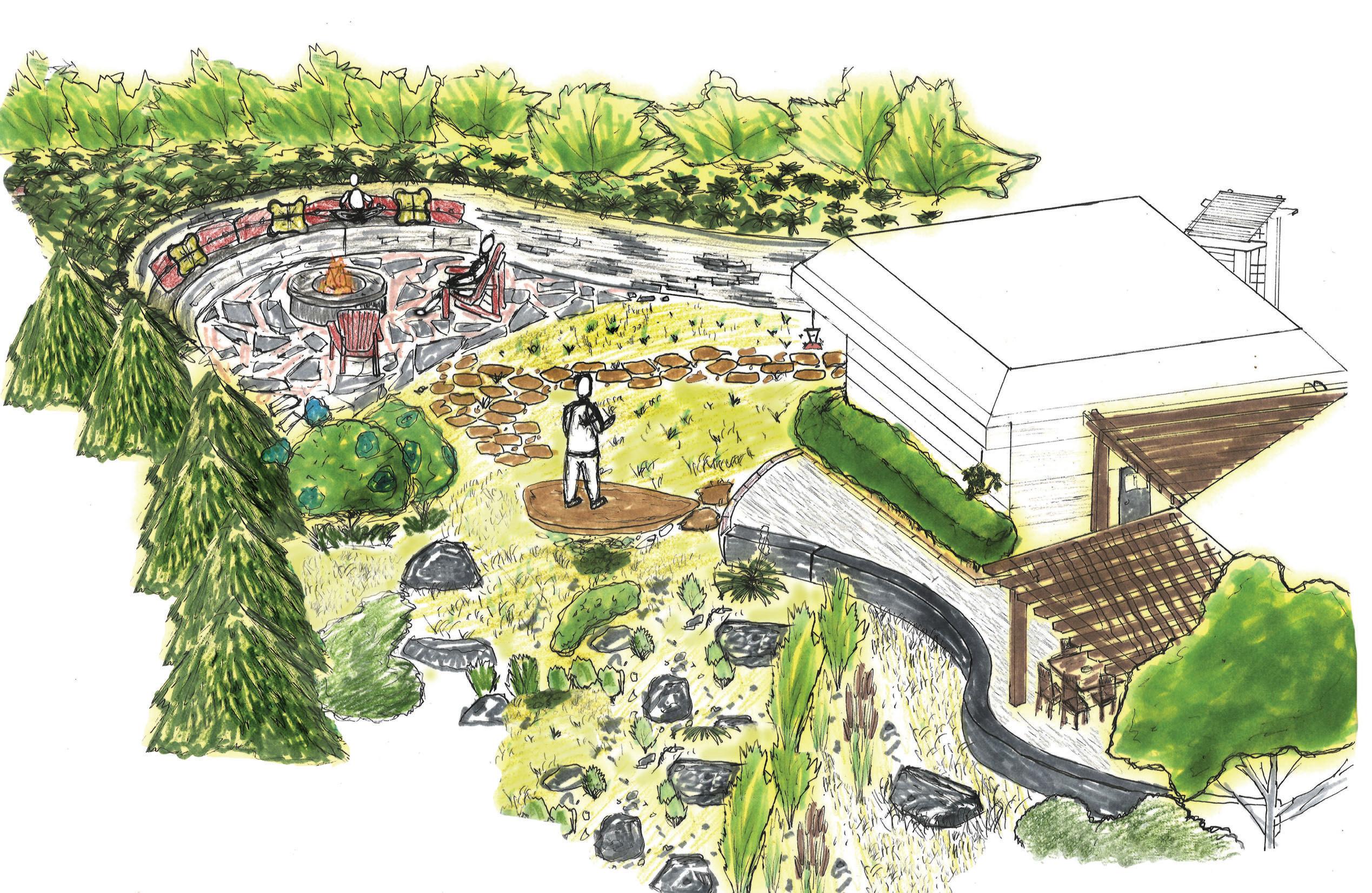 The installation process of these plantings was an arduous yet rewarding experience. I actually put every single plant in the ground for this project. Lyle and I collaborated on the design, but I was granted freedom to make on site. I was given every oppotunity to learn on the job. Lyle is full of knowledge and would take every chance to relay crucial details about what we were doing. Work included planting, irrigation install, tree lighting install, and hardscape construction. Below is the original drawing we did together over a lunch break one day, including Lyle’s notes for irrigation parts.