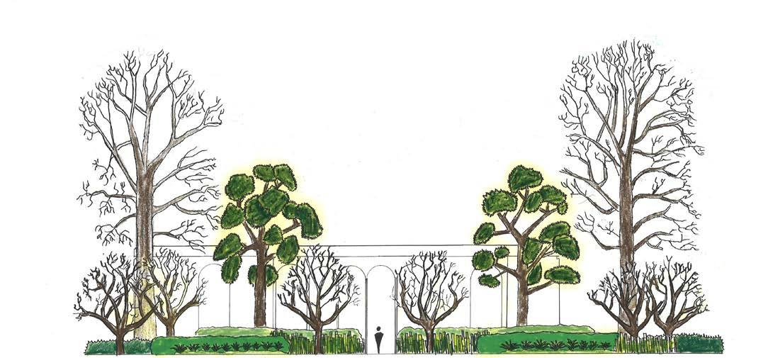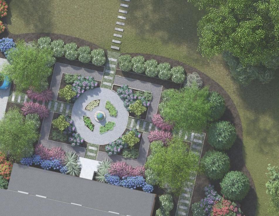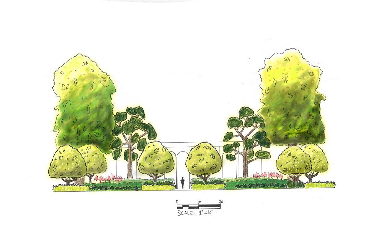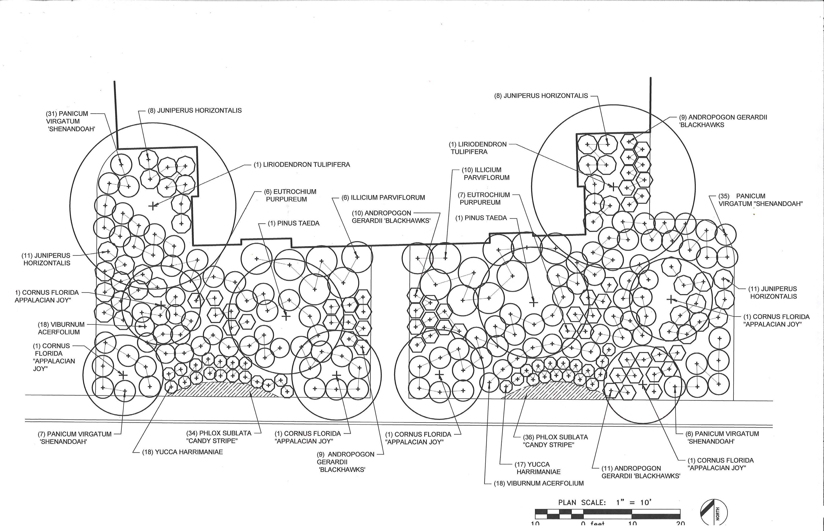This design blends naturalistic elements of the forest into what is an urban commercial landscape. The plant selection is hardy to the local zone 8a/8b, and each provides a function to the local ecosystem. Joe-Pye Weed is a native perennial that is placed centrally to attract bees and other pollinators inward through the other plantings.