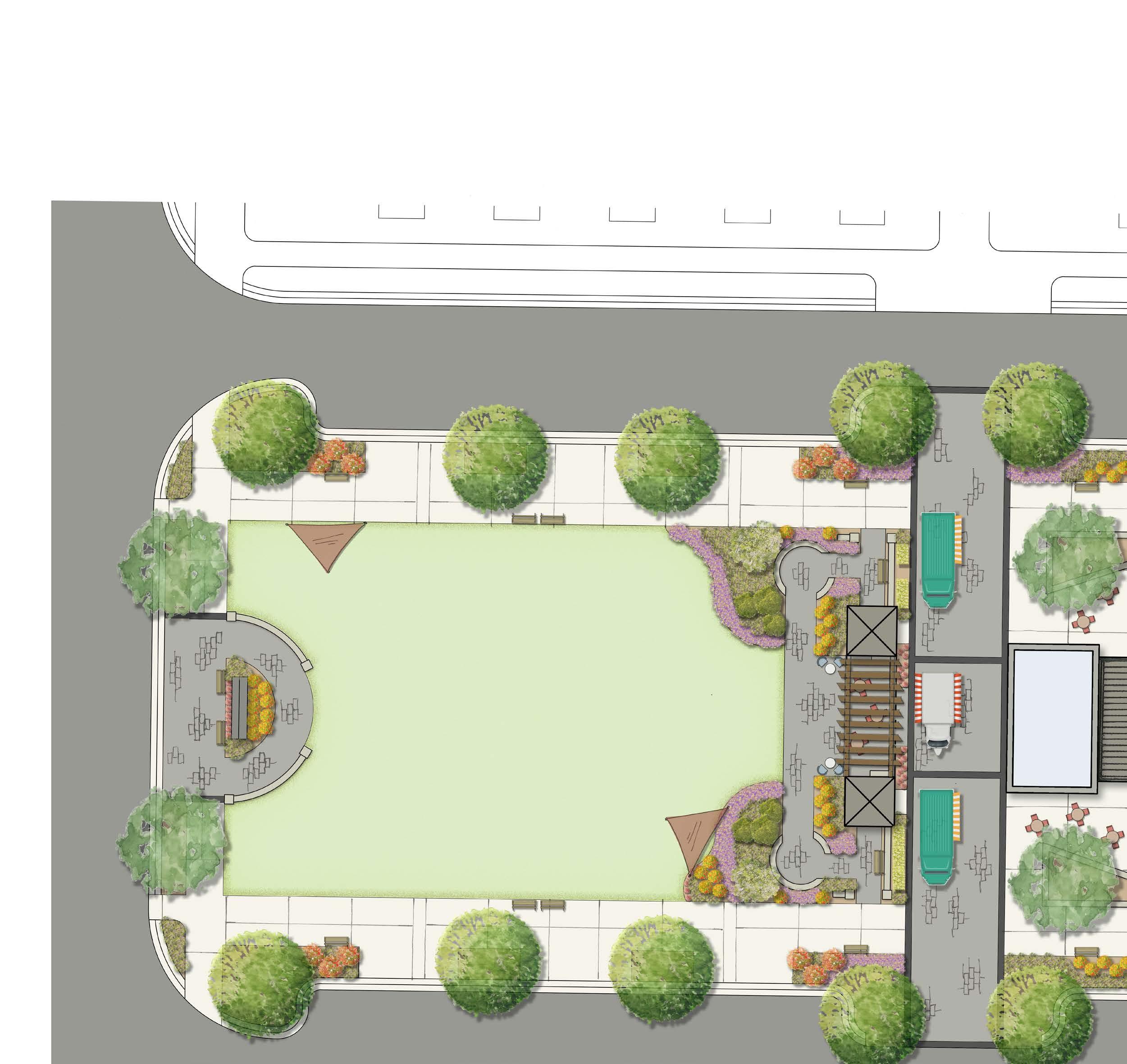 The Village Green is a community park that forms a central activity space between residential and retail zones, and offers concerts, food trucks, open lawn space, art, and community.