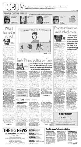 E-MAIL SUBMISSIONS as an attachment to thenews@bgnews. com with the subject line marked “Letter to the Editor” or “Guest Column.” All submissions are subject to review and editing for length and clarity before printing. The editor may change the headlines to submitted columns and letters at his or her discretion. Opinion columns do not necessarily reflect the view of The BG News.