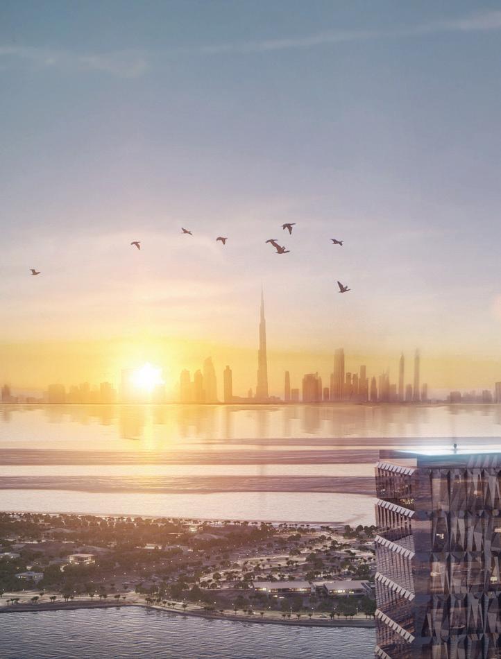 The interstitial space between the primary components provides an aperture with views of the lagoon extending to the Arabian Gulf and the Dubai skyline. Amenities include retail, restaurants, beach club, marina, banqueting facilities, and medical spa.