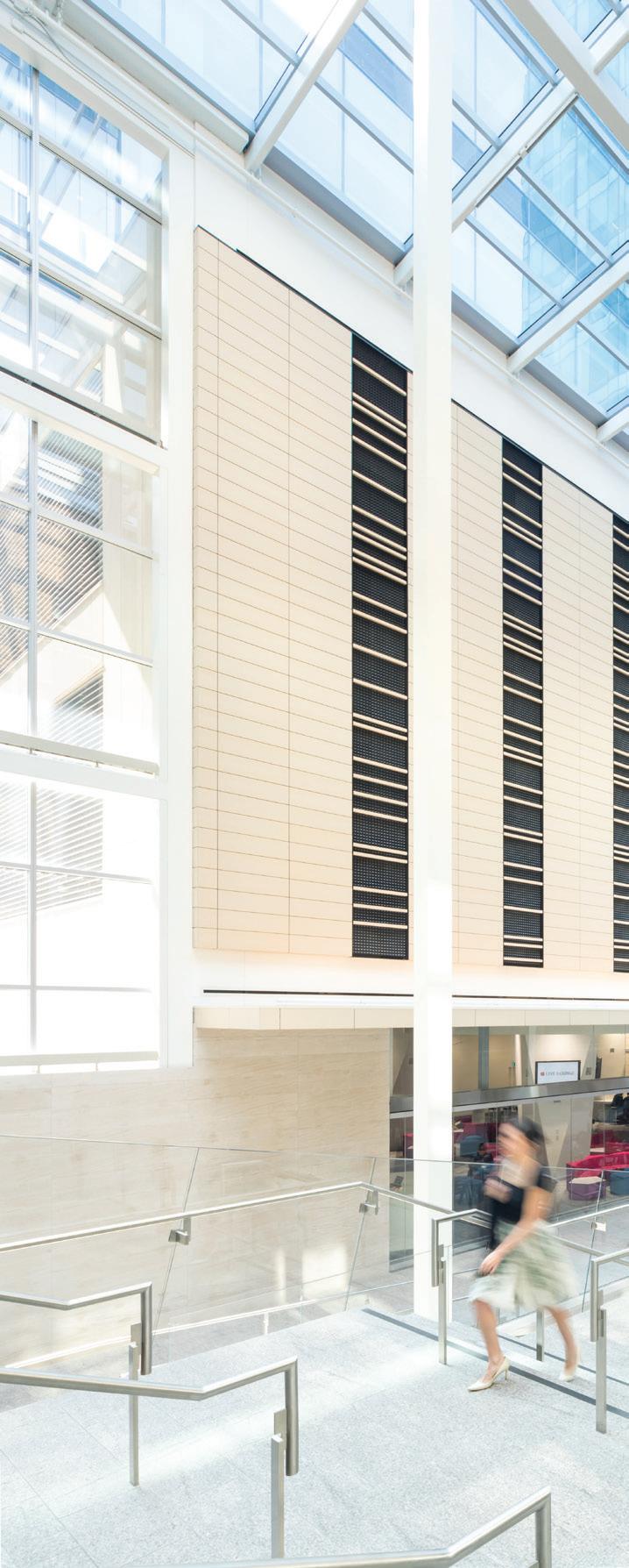 Designed as a “vertical city,” this building aims to create its own neighbourhoods, with amenities and landmarks throughout the office space to support the TD workspace. This cutting-edge office building is equipped with the latest smart building technology and efficient design features, including integration with Enwave’s deep lake cooling system and a reclaimed rainwater management system.