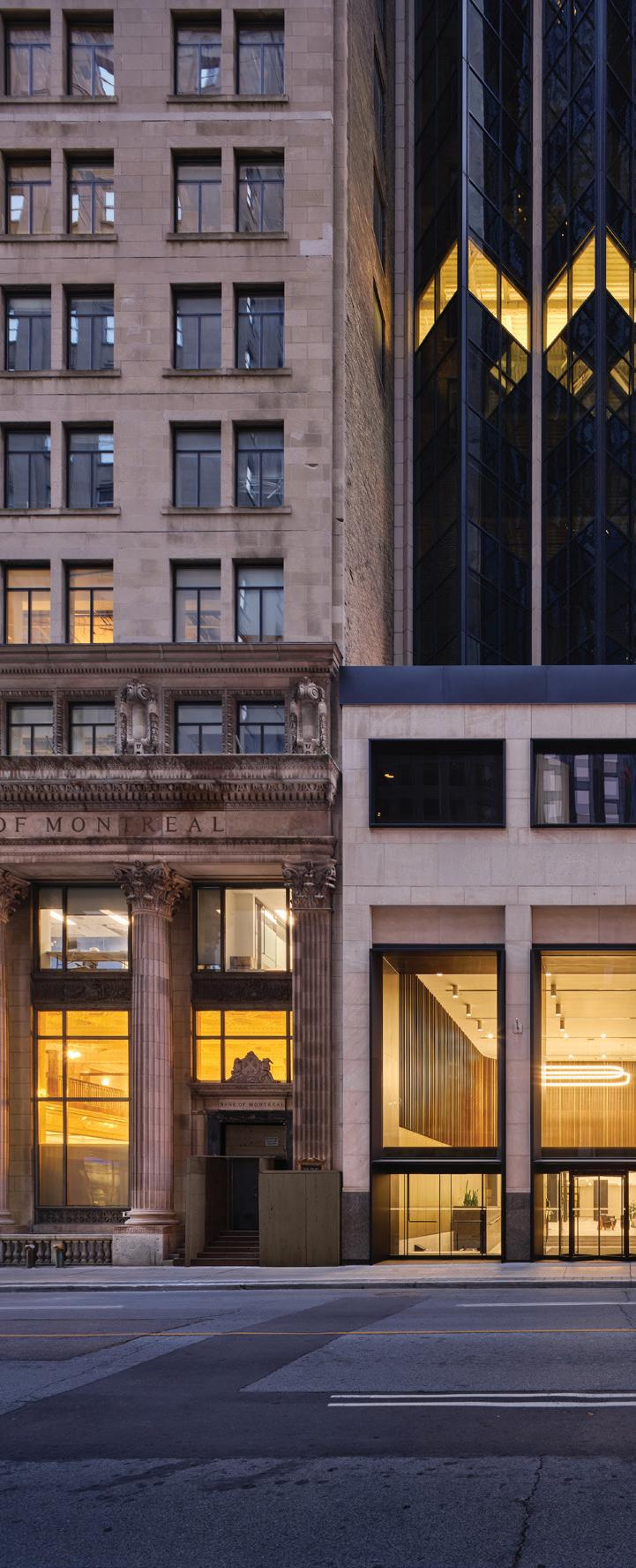 In collaboration with AS+GG, the new office tower preserves the façade of a six-storey heritage building located in the southeast section of the site. Every aspect of the building’s design is intentional, including its unique shape. As the tower rises, it widens and then gradually narrows towards the top, a feature that helps counteract the downward force of the wind. This thoughtful design creates a more comfortable environment for pedestrians at street level.