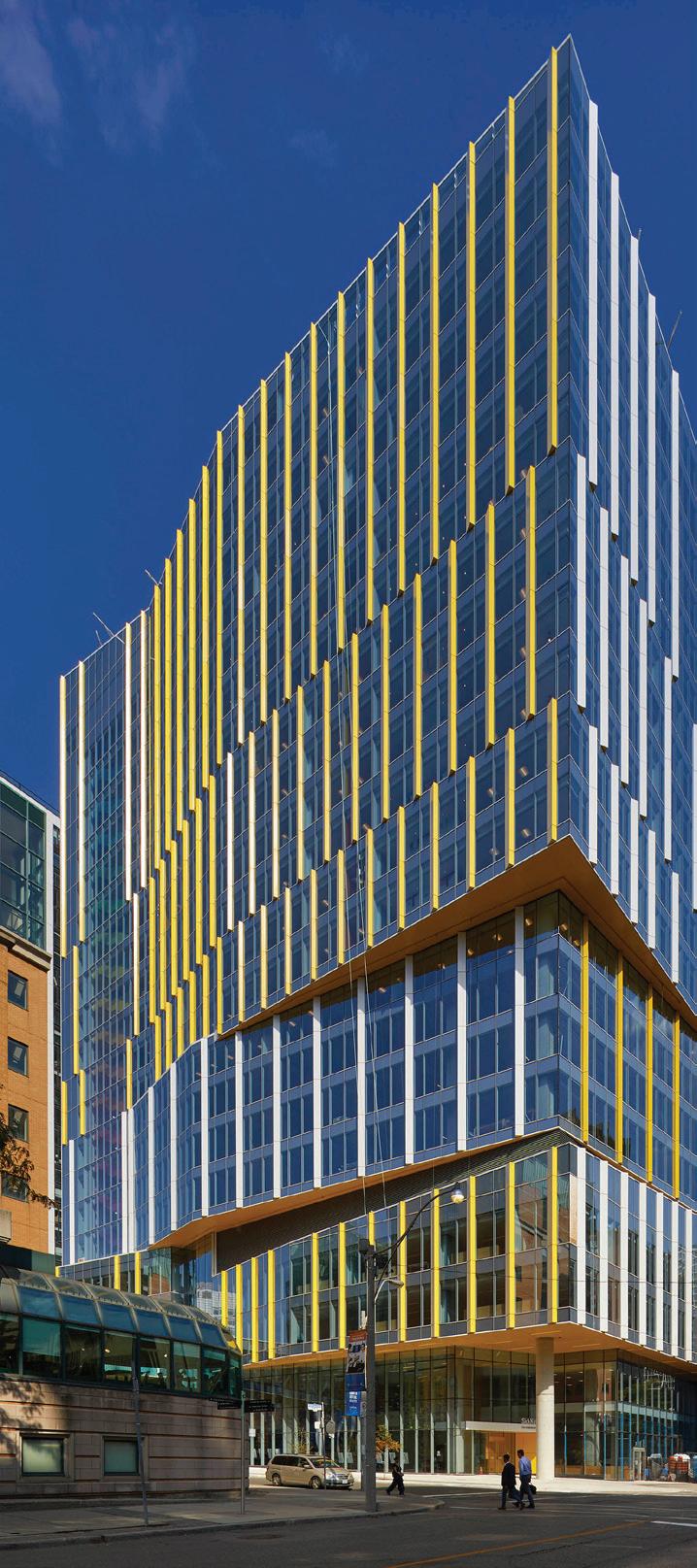 The new home of administration and clinical education at Toronto’s renowned Hospital for Sick Children, the new Patient Support Centre will anchor a renewed SickKids campus and support a collaborative and innovative organizational culture. A two-storey entrance level is wrapped in transparent glass to activate the Elizabeth and Elm street corner; inside, a café and social hub will attract passers-by and provide a vibrant new destination for SickKids staff and the Discovery District community. An undulating façade with vertical fins animates the tower above, the sense of motion amplified by a colourful glass-walled staircase and pedestrian bridge connected to the main hospital buildings. Office workplaces are open and airy, with flexible desking systems and casual seating to accommodate both individual and group work. A rooftop event space and garden terrace capture unobstructed southern views and sunlight.