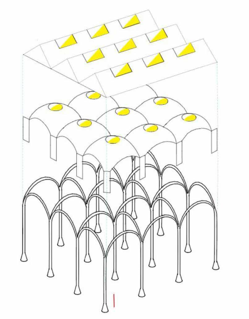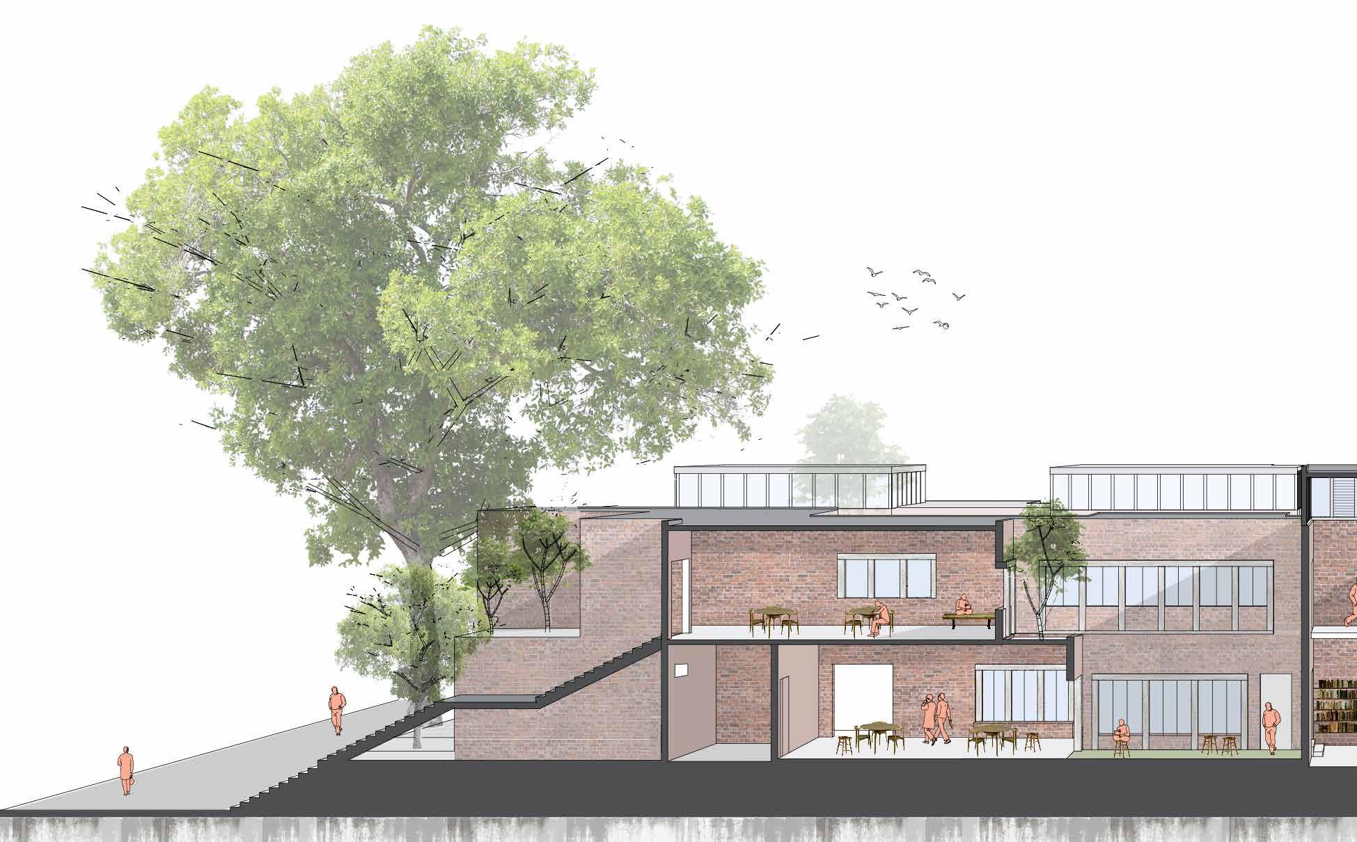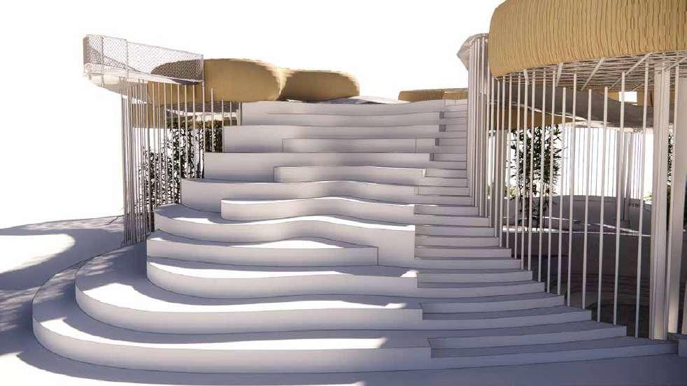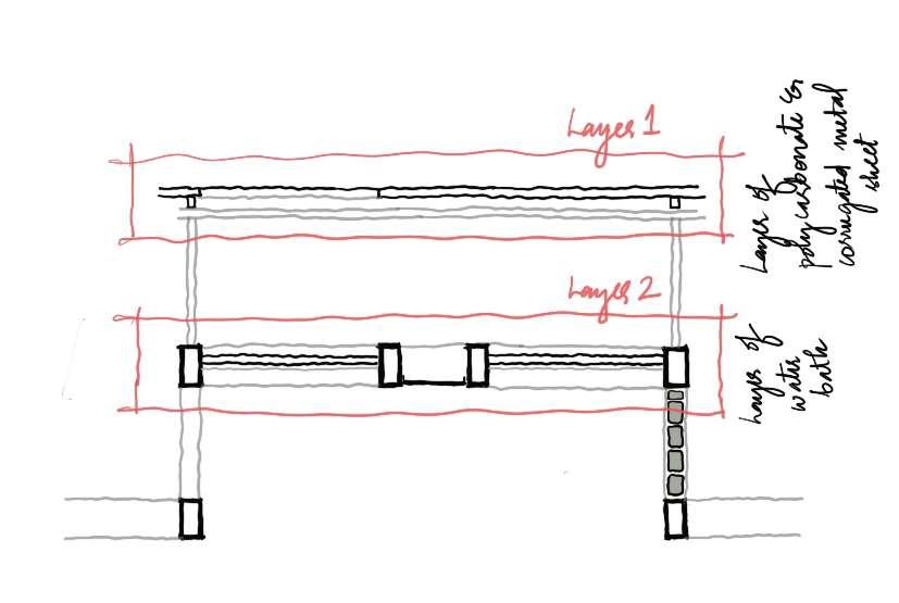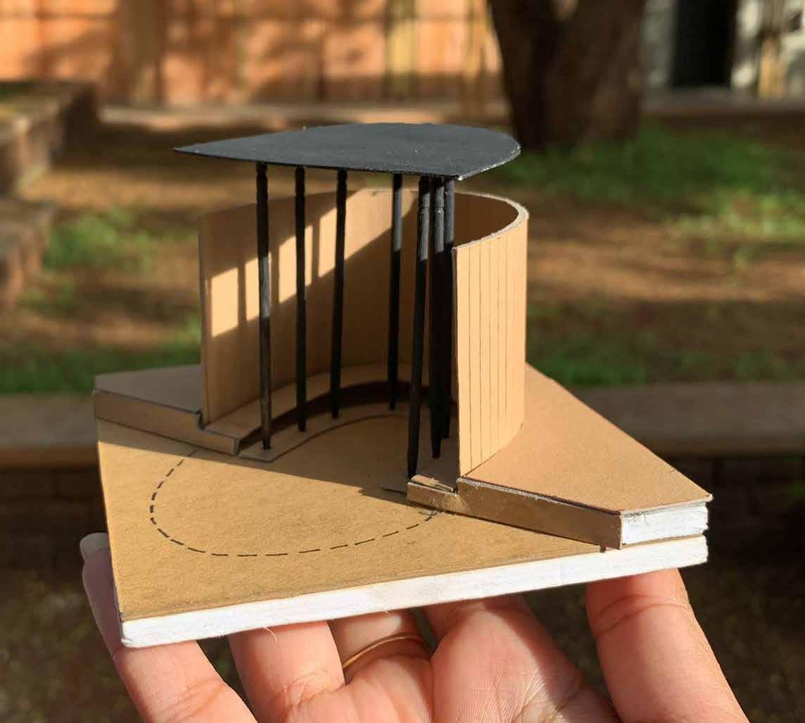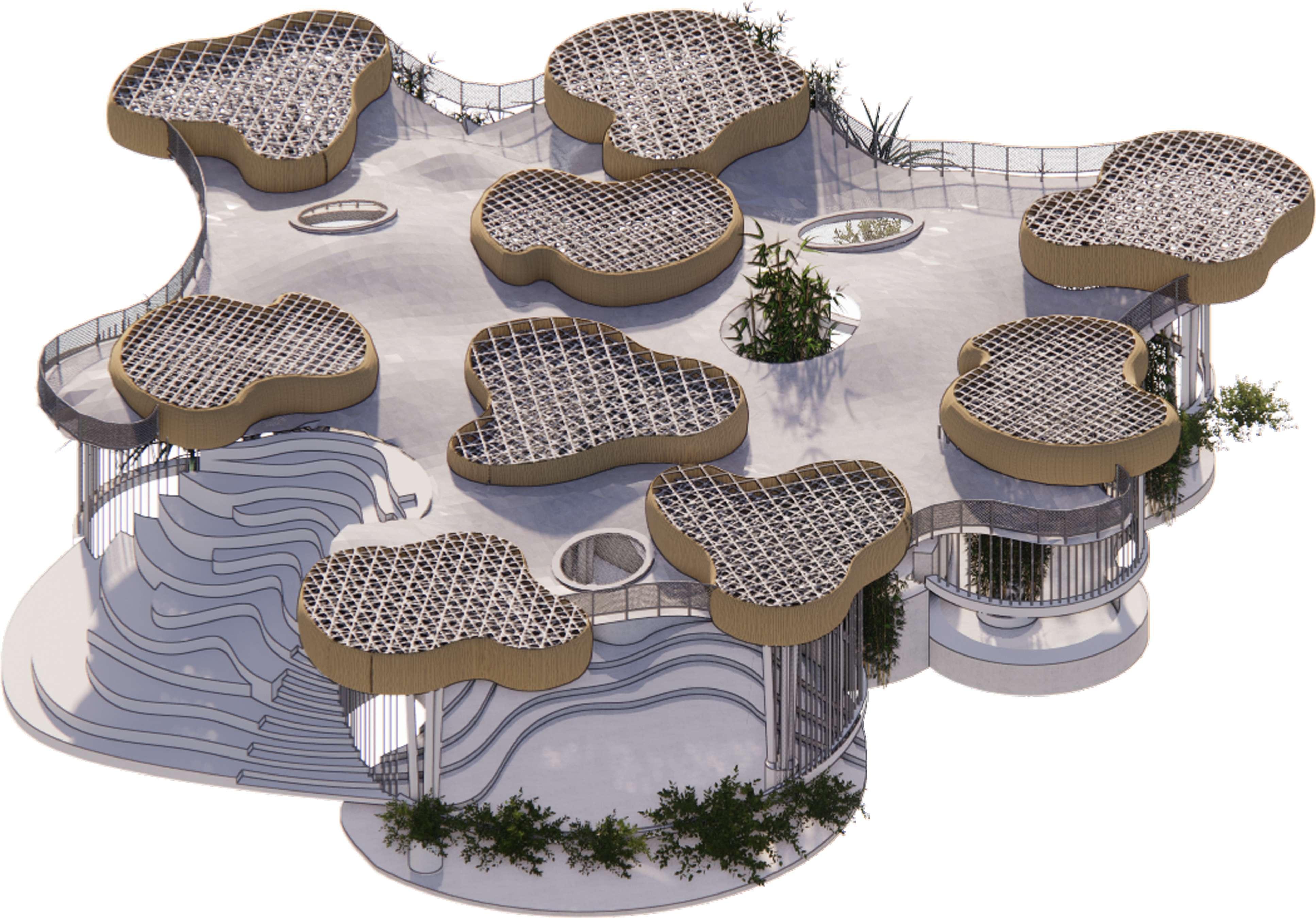 The pavillion attempts to carry forward the same spirit and history of the place, and maintain a similar use of the space- which is to provide a free space for people to gather communallywhile also adding a layer of playfulness and dynamism to the space. Thus, the space not only aims at capturing the quality of static activities (such as gatherings and protests) that take place under a tree, but also yearns to propagate the dynamic activities (play) that usually take place under and around a tree. The experience of a tree in terms of a spatial quality is thus abstracted by the canopies that imitate the quality of filtered light that a tree provides, while also being inorganic and free in form and material. The underground plinths behaves as a static plane, while the undulating roof serves as a dynamic membrane.