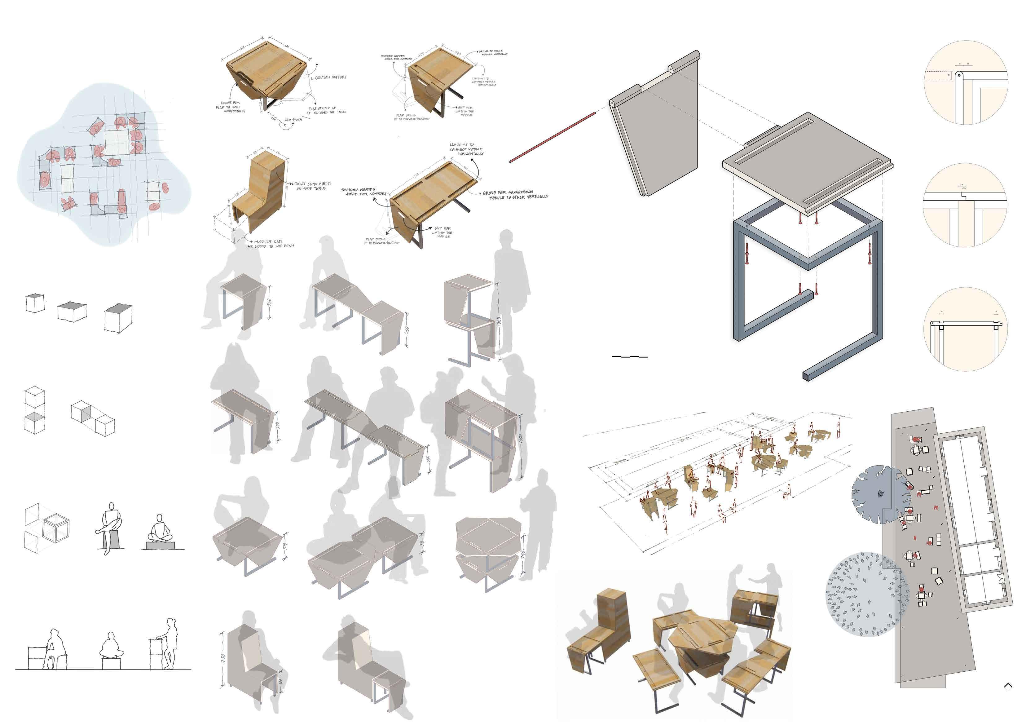 The brief entailed designing furniture for the canteen on campus- pieces that would adapt to the multivalent language of the canteen, the temporality of the space and would accommodate different sizes of crowds through different points of the day.