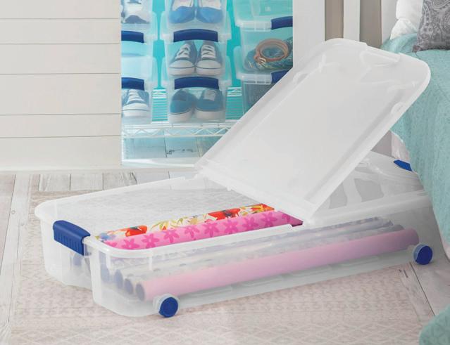 door coat hooks can be handy for coats and jackets that need to be grabbed quickly (because we know these students aren’t getting up in time to make it to that 8 a.m. class without rushing out the door). And, while we ordinarily think “up” when we’re talking about vertical space, don’t forget about the unused floor space beneath beds or futons. These under-bed storage bins are great for items that don’t need to be accessed regularly, like off-season clothing.