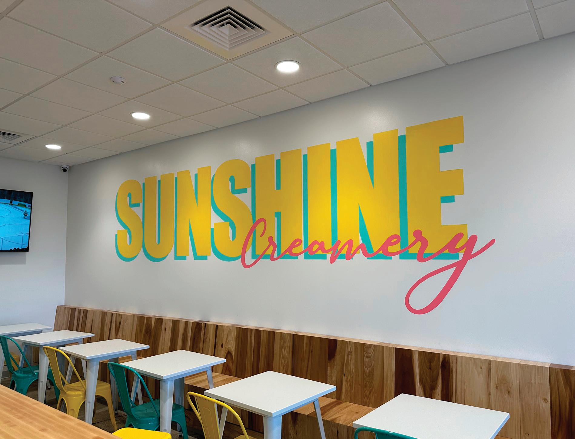 We recently stopped by the brand-new Sunshine Creamery, which opened in late April in the old Continental Florist location off Rocky Ridge Road. The shop stands out in its brick strip mall location, thanks to a bold, colorful sign and large windows that give approaching guests a view of the bright yellow and aqua stools and neon ice cream “open” sign.