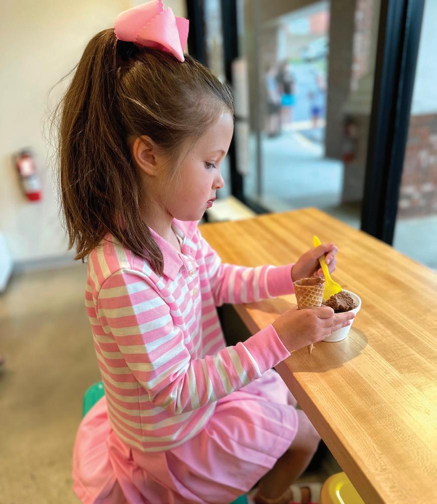 fact, the first time we tried to stop in for a scoop, the Monday after their Friday ribbon-cutting, the lights were off, and a handwritten sign informed us that the creamery was closed for restocking and would reopen the next day. Perhaps it was my six-year-old daughter’s peering (read: nosy) face in the window, but before we could get back to our car, Jarrard jogged out with an ice cream cookie sandwich, a coupon, and an apology, sharing with us that even their tons of backstock had been sold over the weekend. This sounded like a great opening weekend “problem” to us! I appreciated him taking the time to come out and greet us, an unnecessary but very kind gesture. My daughter graciously allowed me a few bites of the (delicious!) ice cream sandwich, and we returned the next day to try more.